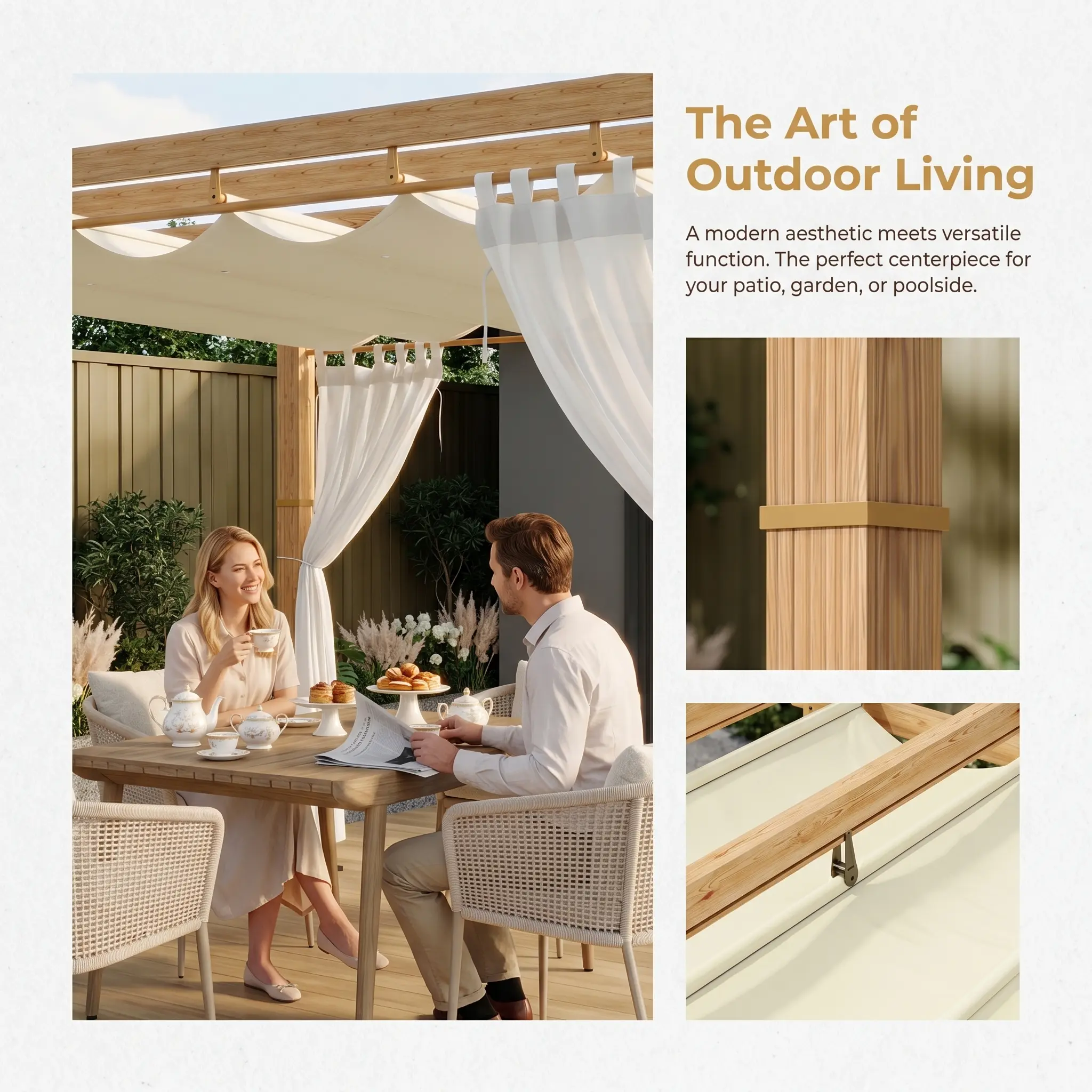 · 【Modern & Versatile Design】The stylish wood-grain pillars pair with a functional canopy and mesh netting, enhancing patios, decks, gardens, or poolside spaces, and bringing contemporary elegance to your outdoor lifestyle.