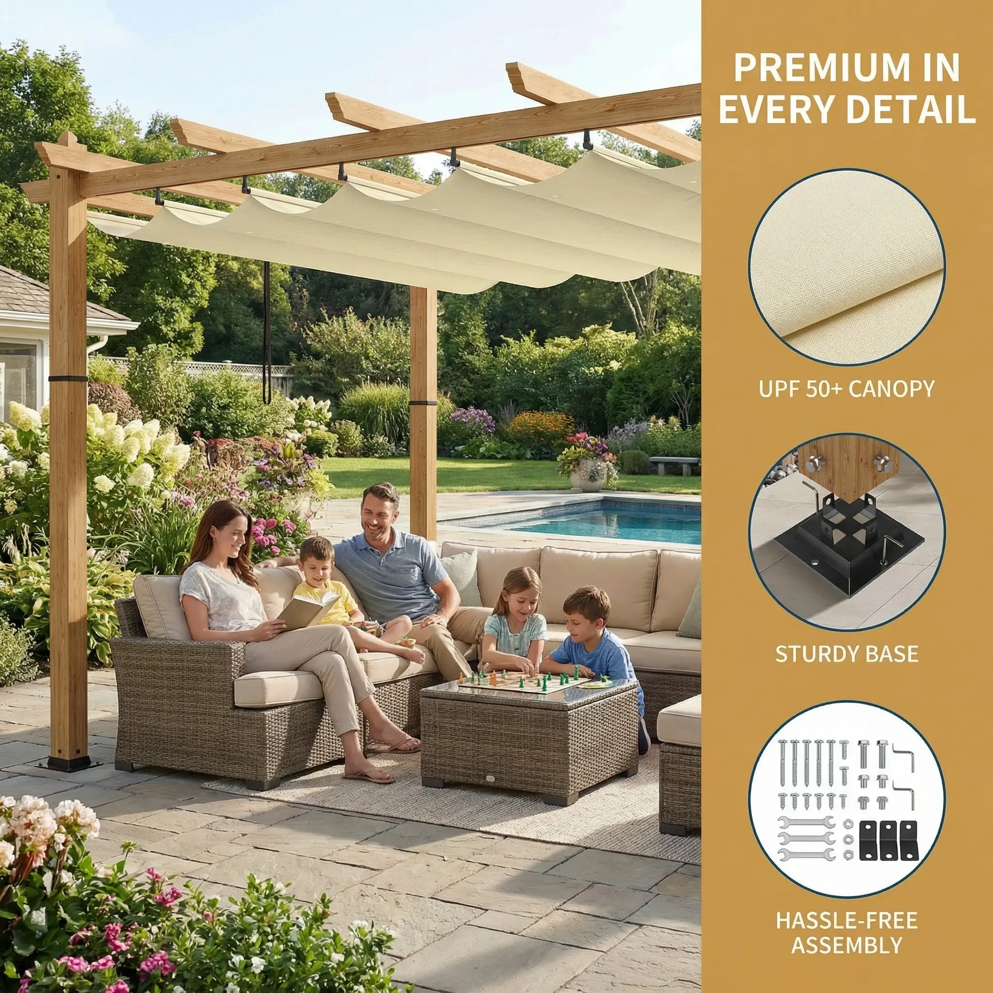 · 【UPF 50+ Sun & Rain Protection】Retractable polyester canopy offers UPF 50+ for 99% UV blockage and rain mesh panels. Enjoy a shaded, well-ventilated outdoor area—perfect for relaxing, dining, or entertaining year-round.