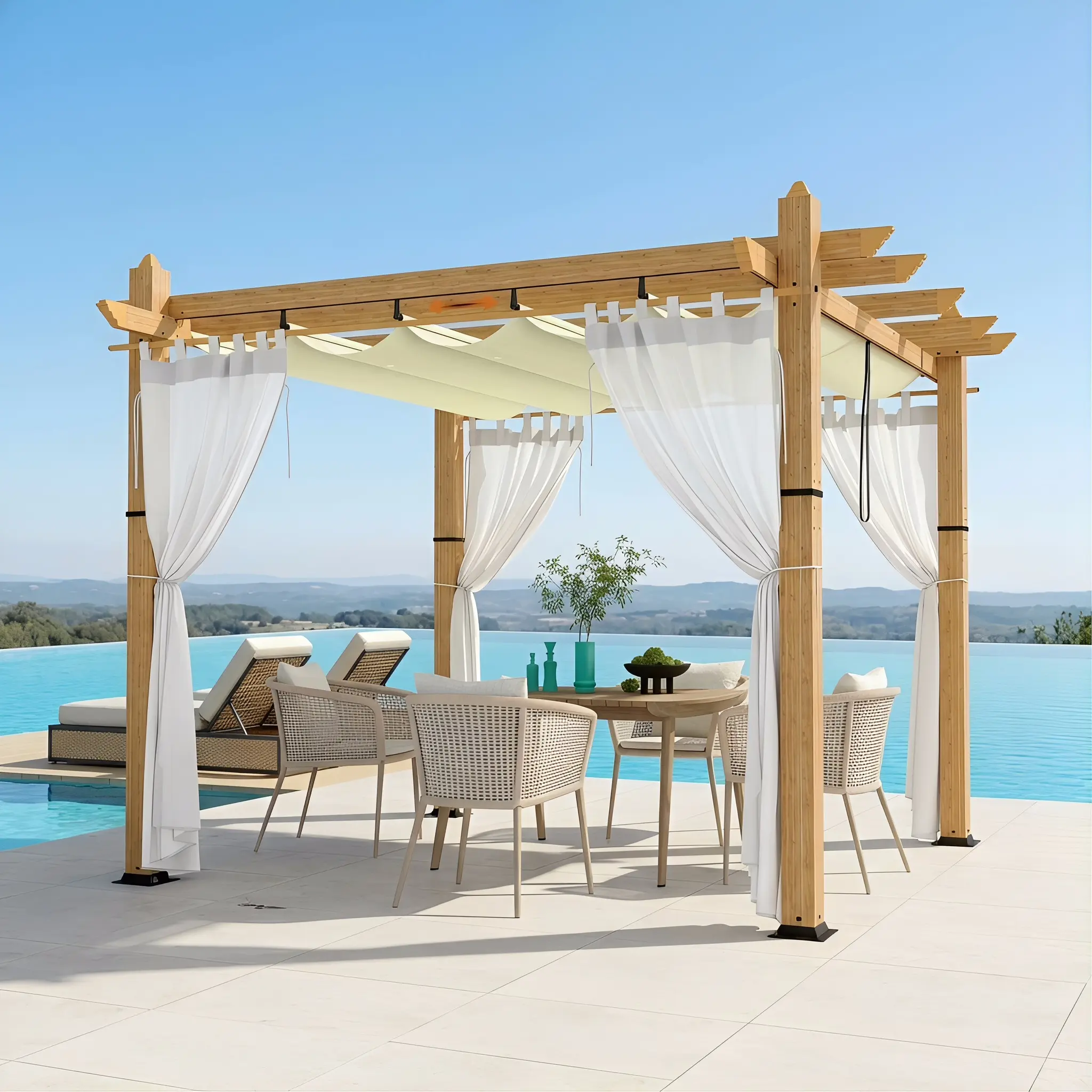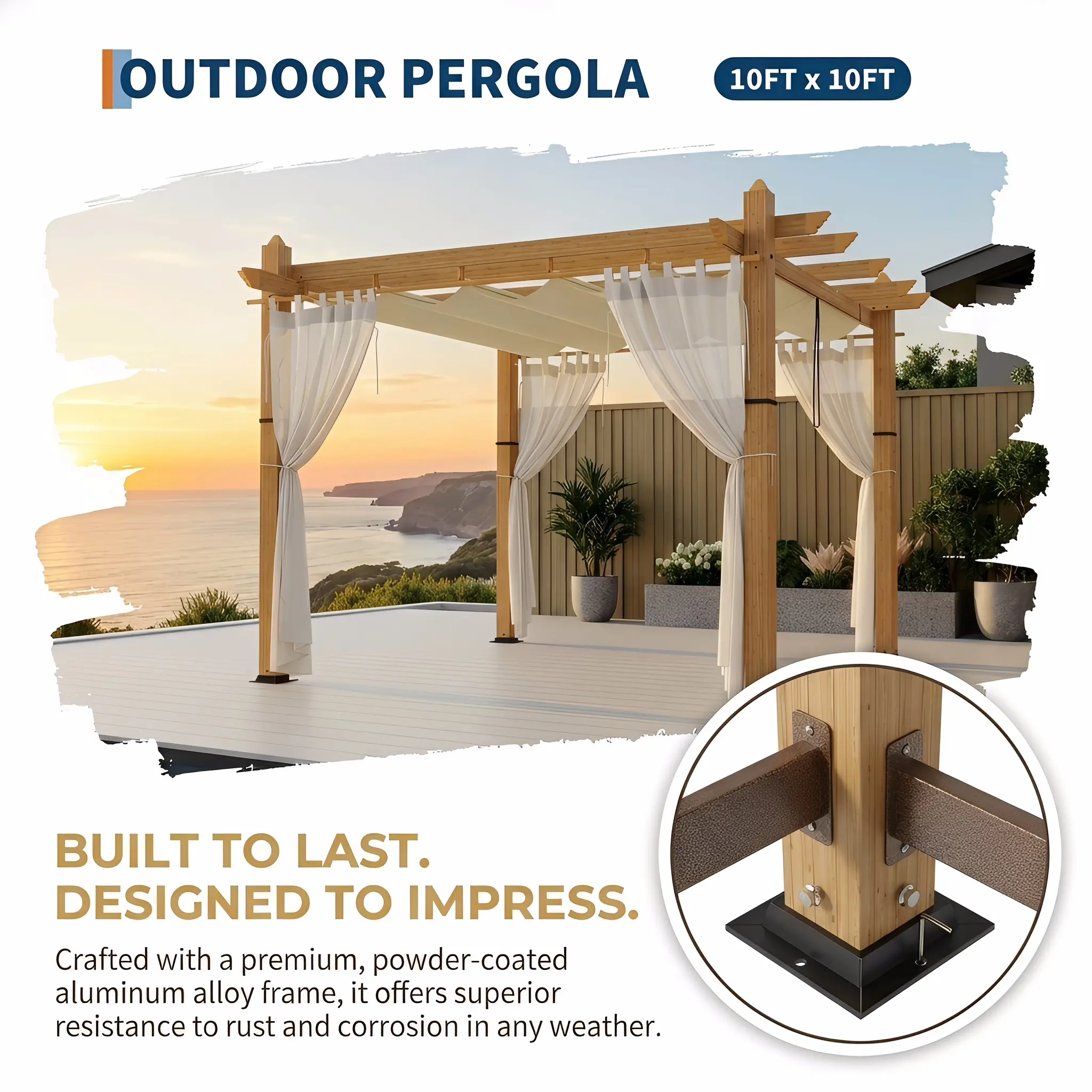 · 【Durable Aluminum Frame】Crafted with a premium aluminum alloy frame and a powder-coated wood grain finish, this pergola delivers lasting rust and corrosion resistance, ensuring beauty and strength in any weather.