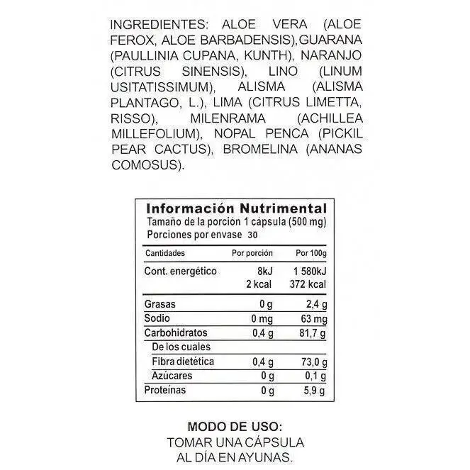 Aloe Vera, Guarana, Citrus Sinensis, Flax seed, Water Plantain (Alisma Plantago), Lime, Yarrow, Prickly Pear Cactus, Sarsaparilla, Dandelion, Red Tea, White Tea.