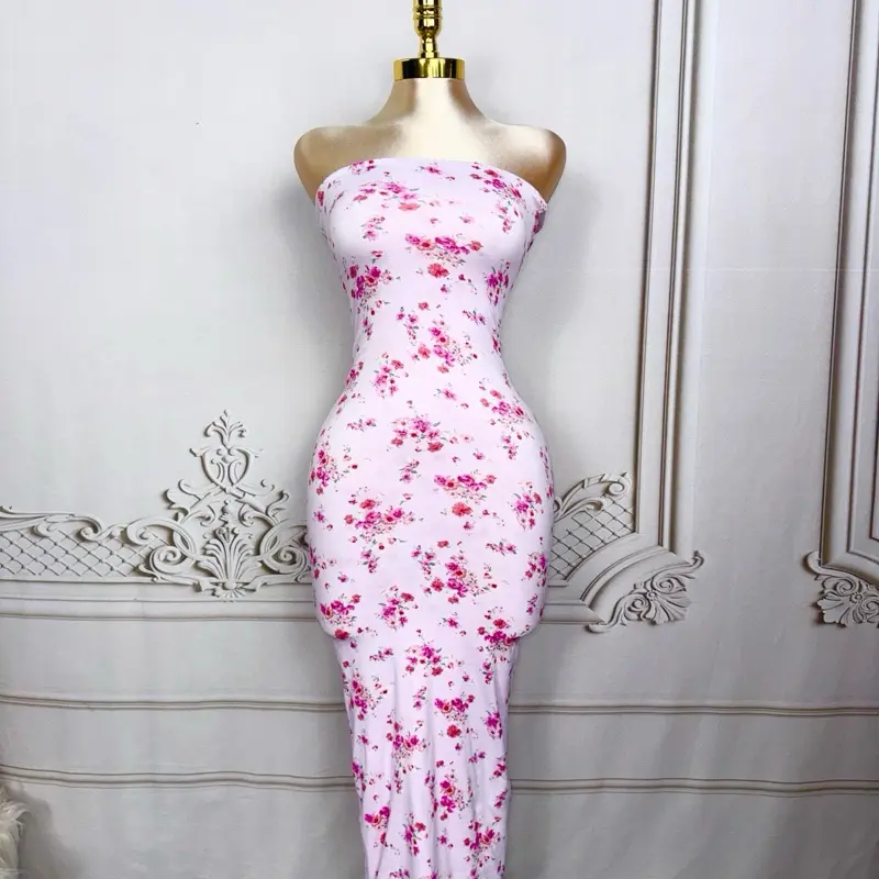 ChicMe Women's Tropical Floral Print Smocked Maxi Dress Ruched Bandeau Cutout Summer Vacation Dress Elegant Shirred Ruffle Hem Mermaid Beach Dress/Seaside Vacation Sleeveless Skirt
