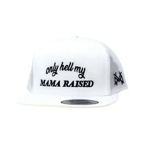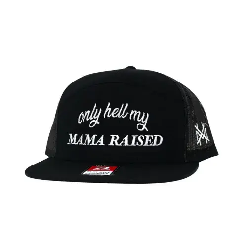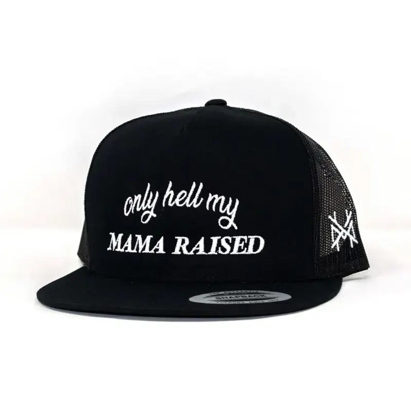 5. Only Hell My Mama Raised Black Trucker Hat Snapback Mesh Back Baseball Cap Premium White Embroidery Edgy Country Style High Quality Adjustable Headwear Gift for Men and Women