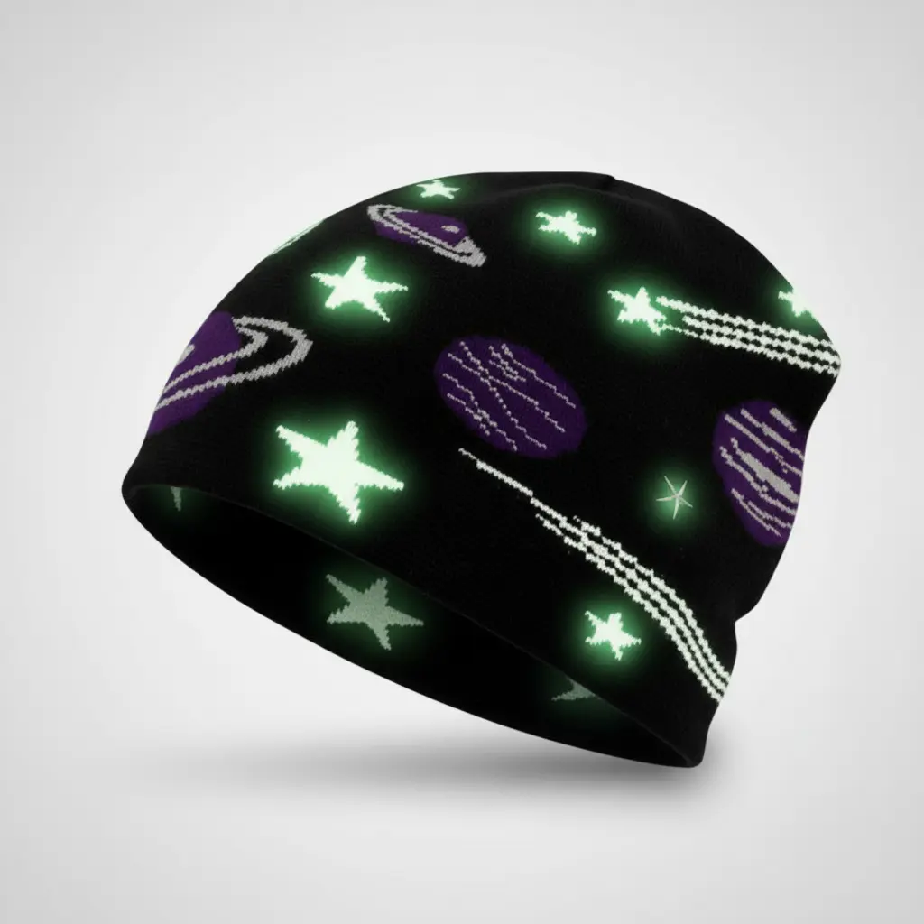 Keywords: space, streetwear, glow in the dark, beanies, weird hats, space gear, handmade knit.