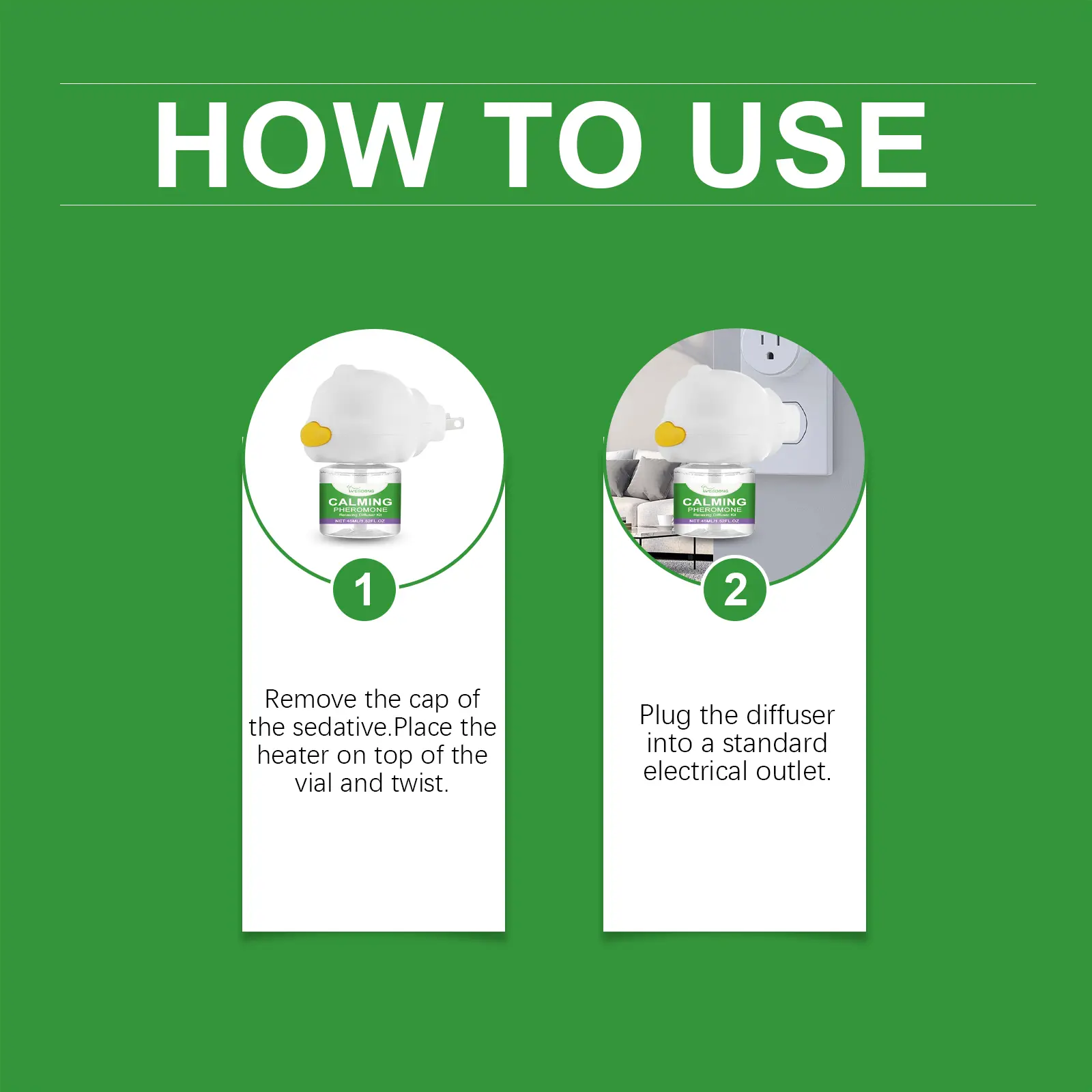 Plug in the diffuser in areas your cat frequents. Use daily to help maintain a calm, comfortable environment for your feline friend. Results may vary depending on your cat’s individual behavior.