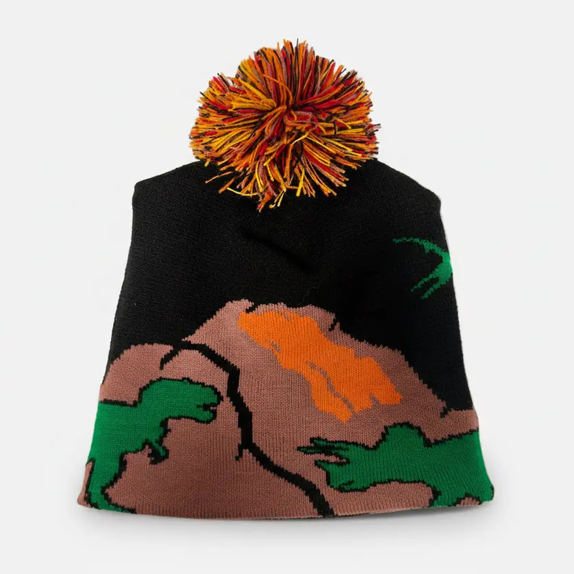 Dinosaurs Handcrafted Beanie with T-Rex Triceratops Volcano Scene Pterodactyl Lava Pom Knitted for Warmth and Comfort One Size Fits Most