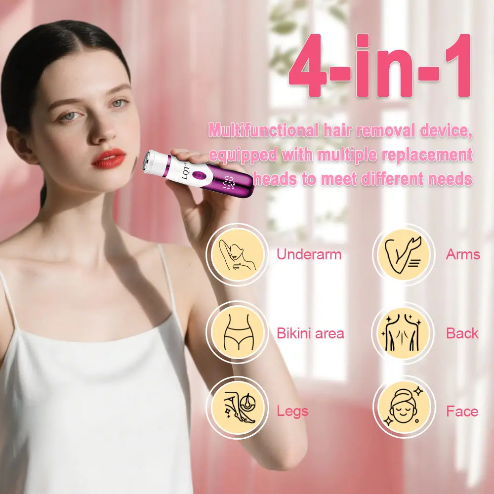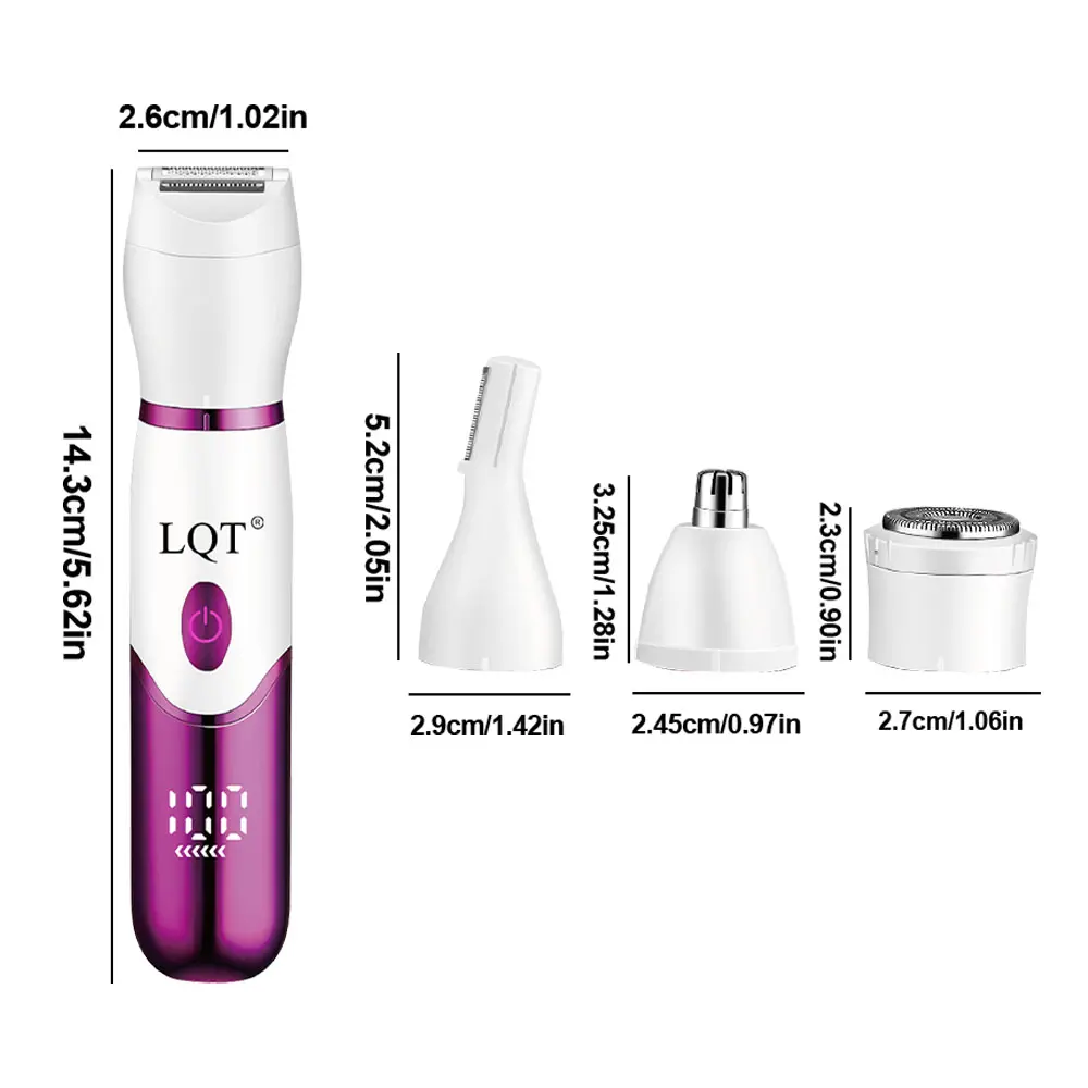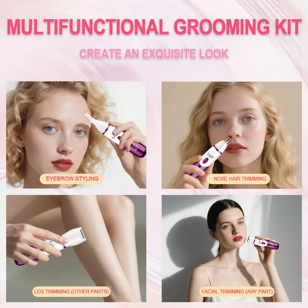 LQT 4-in-1 Multi-Functional Women’s Electric Grooming Kit, designed for gentle hair removal and styling for the whole body. It handles hair management for the face, body, and delicate areas in one compact device, perfect for at-home use and travel,