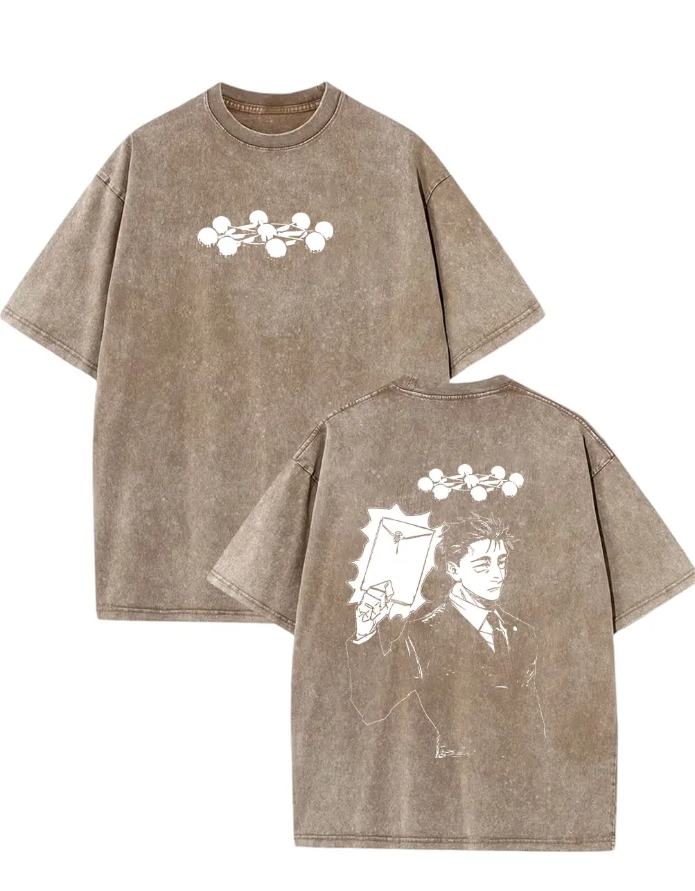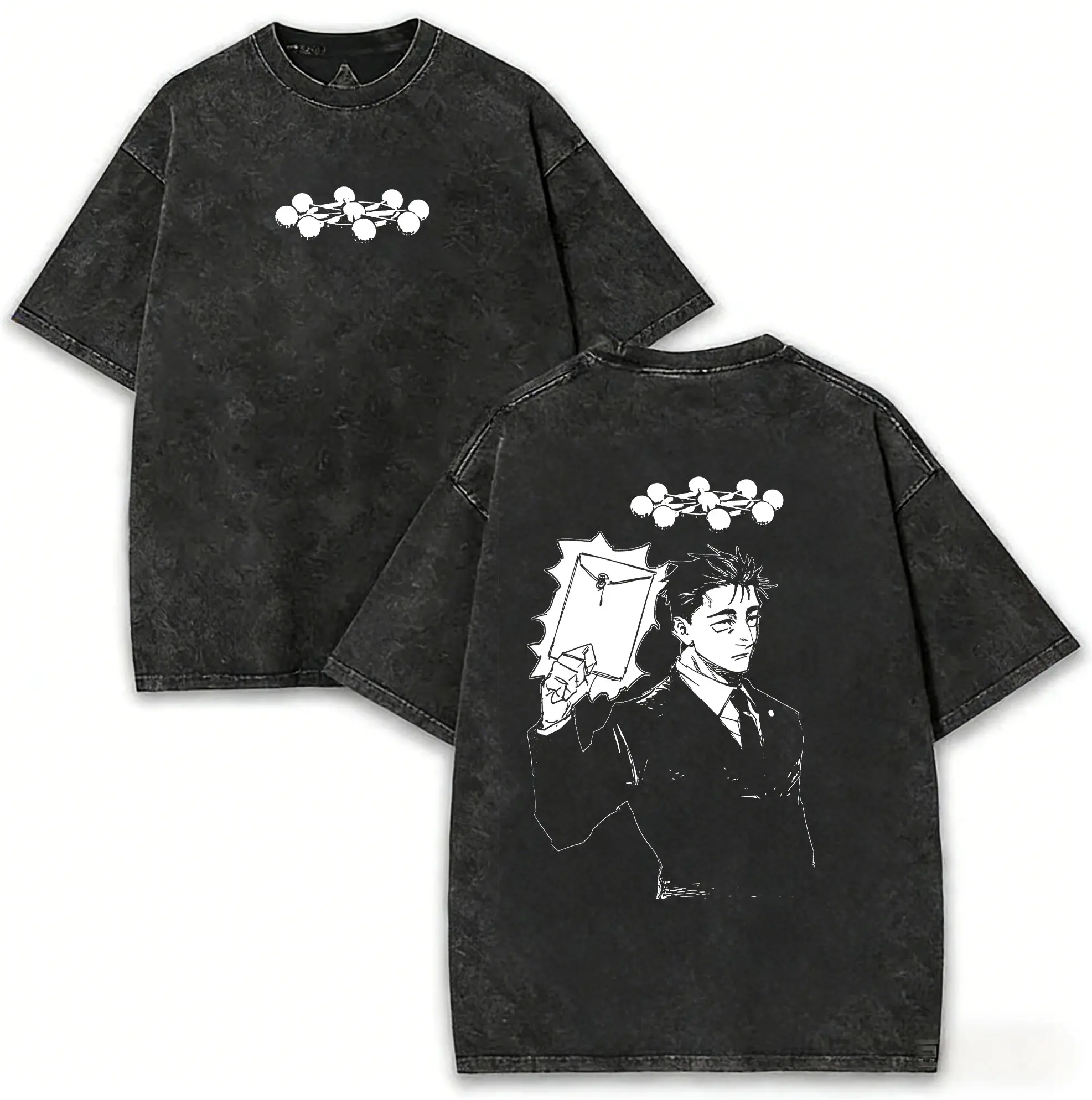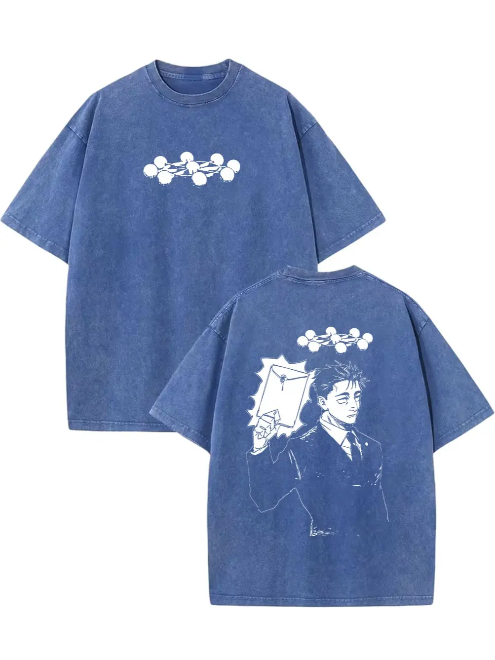 Classic oversized/boxy fit that flatters all body types, offering a comfortable, laid-back silhouette. The washed blue base makes the bright white character art and domain symbol pop, creating a striking, high-contrast streetwear aesthetic. Easy to pair with jeans, cargo pants, or sneakers for a versatile, anime-ready outfit. Unisex design works for men, women, and teens!