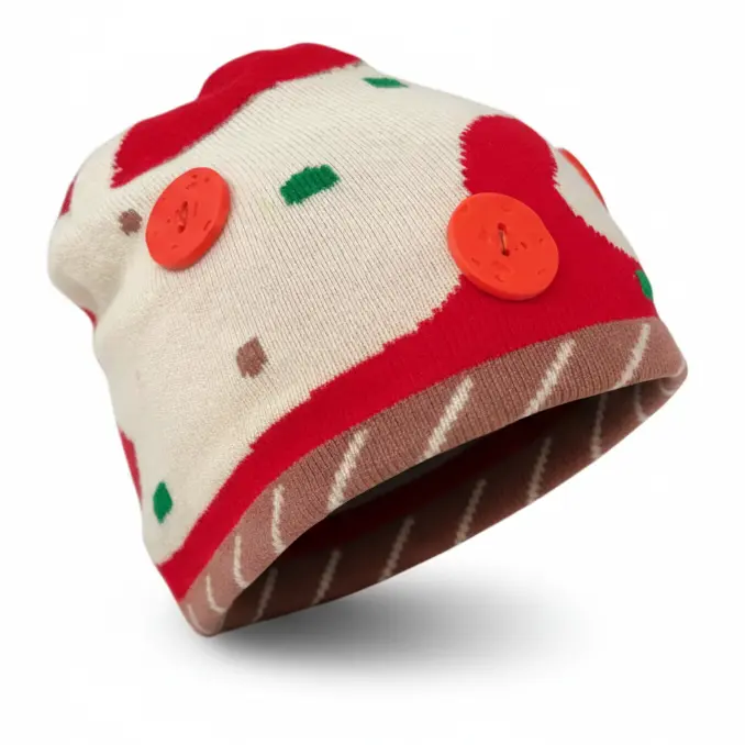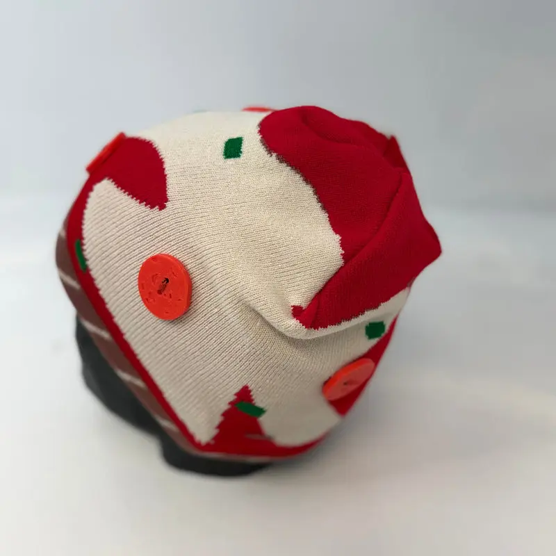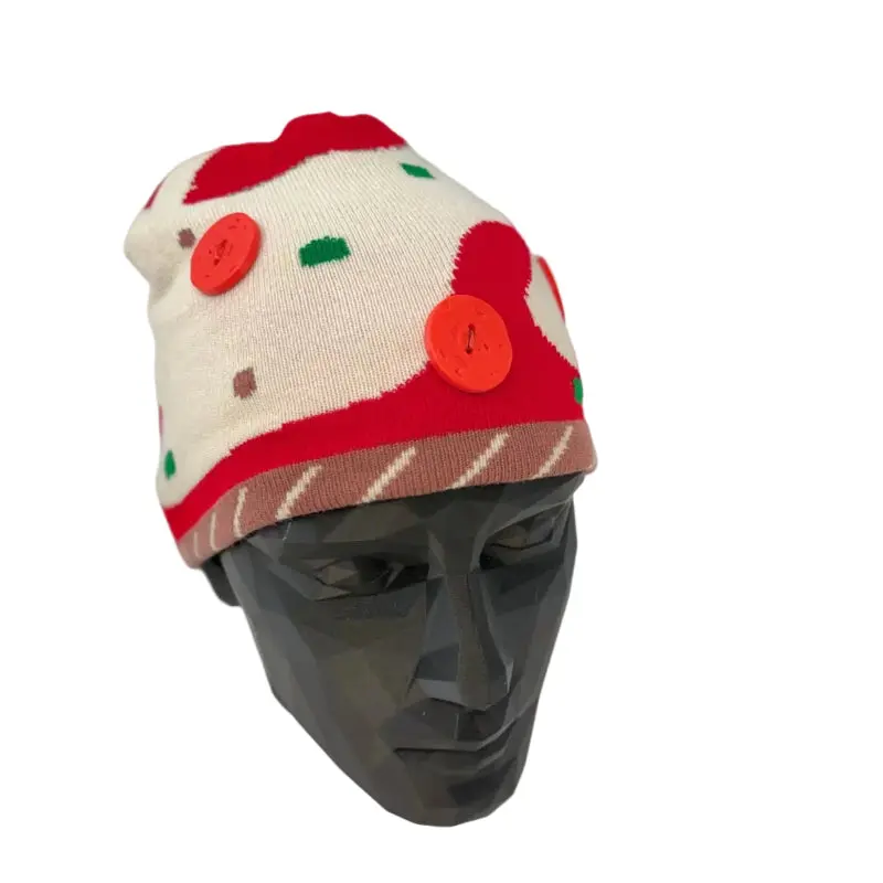 The soft toque silhouette fits most heads perfectly. It's your go-to grab-and-go accessory. The beanie's design includes red and white colors with green and brown accents. It's a fun, wearable piece that adds a playful touch to your outfit. Enjoy the coziness and style it offers.
