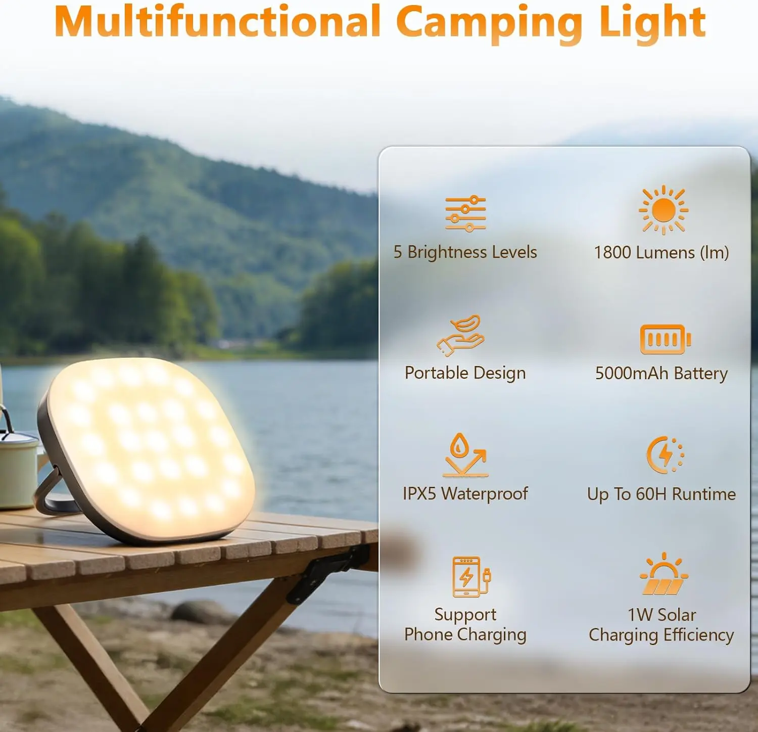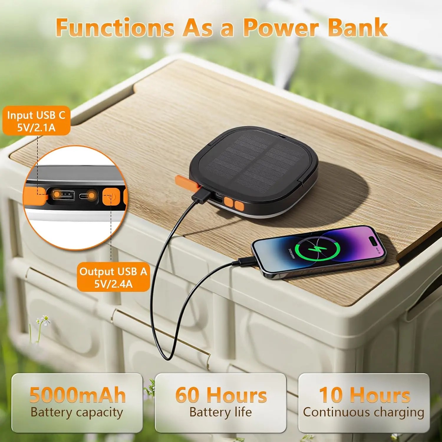 5000mAh Solar Camping Lantern - USB/Solar Rechargeable, IP65 Waterproof with 5 Light Modes. Power Bank, Emergency Light for Hurricanes, Hiking, Home, or Blackouts