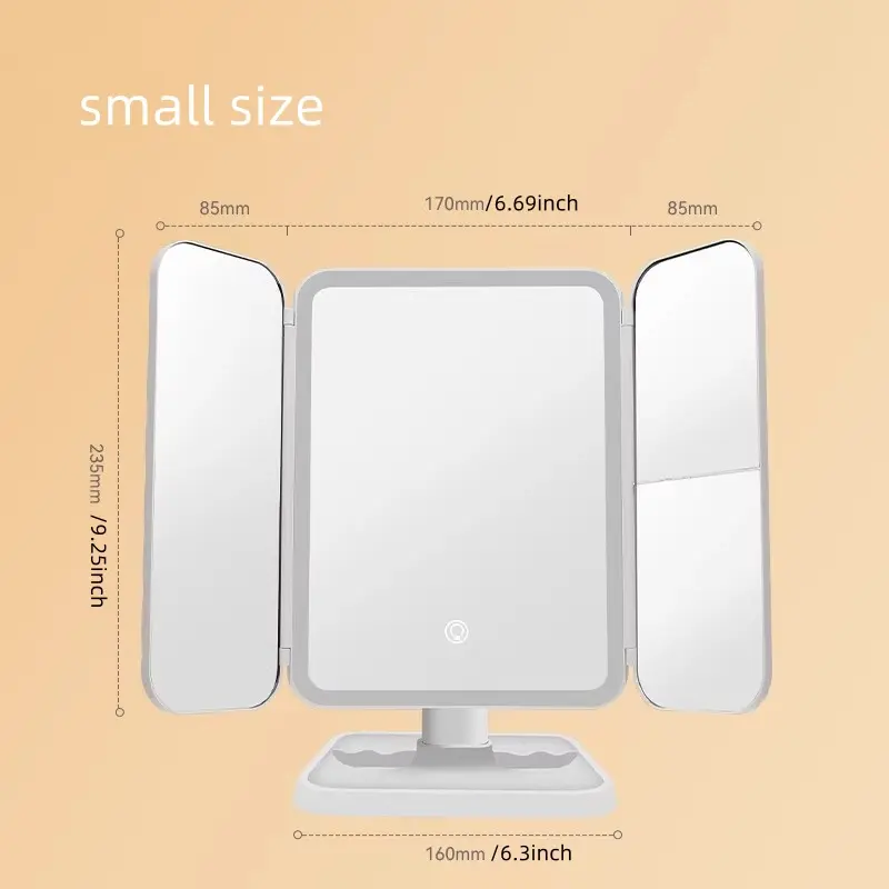 This tri-fold LED lighted makeup mirror is ideal for dorm use. It's foldable, making it convenient for students and girls. The mirror is designed for daily makeup routines, ensuring you have a reliable tool for your beauty needs. Its compact size fits easily on any desktop, providing a practical solution for your vanity needs.