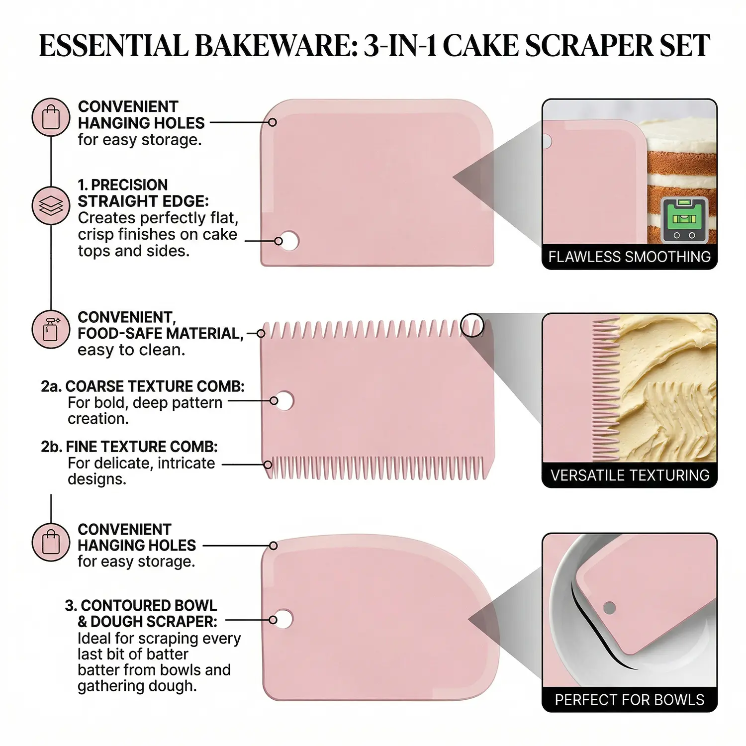 3 Cake Scrapers (Flat, serrated, & curved edges for every texture & finish)