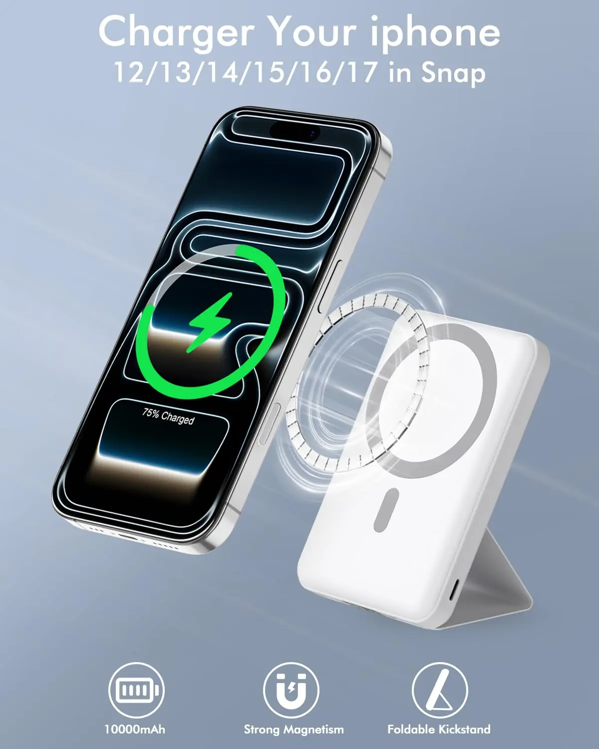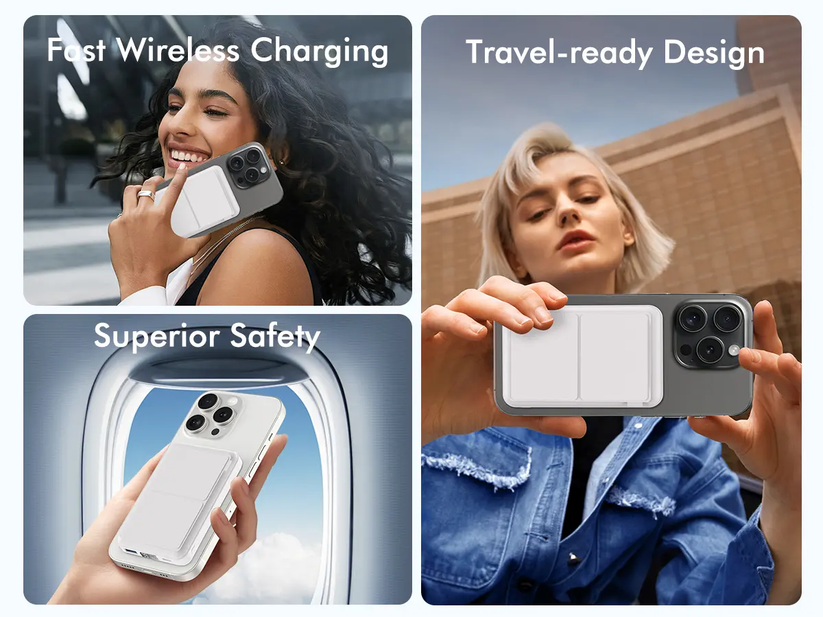 Equipped with a large-capacity, high-density 10,000mAh battery, this wireless power bank provides all-day power to keep you connected. Its ample power reserve makes it an excellent companion for your travels and outings. This wireless charger can fully charge an iPhone 17/16/15/14/13/12 Pro/Pro Max or 16/15/14/13/12 Plus approximately 1.5 times, and an iPhone 17/16/15/14/13/12 or iPhone Air approximately 2.2 times.