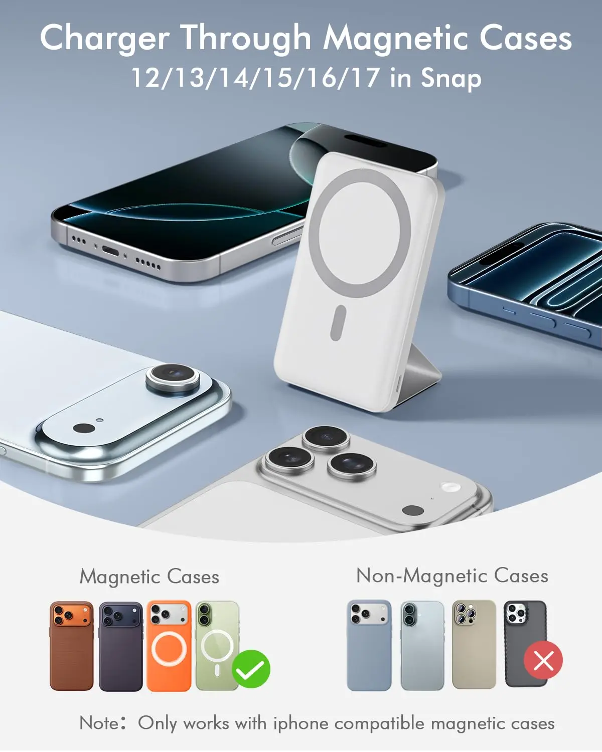 This portable charger is perfectly designed for the iPhone Air, iPhone 17, 17 Pro, 17 Pro Max, iPhone 16, 16 Plus, 16 Pro, 16 Pro Max, iPhone 15, 15 Plus, 15 Pro, 15 Pro Max, iPhone 14, 14 Plus, 14 Pro, 14 Pro Max, iPhone 13, 13 mini, 13 Pro, 13 Pro Max, iPhone 12, 12 mini, 12 Pro, and 12 Pro Max.