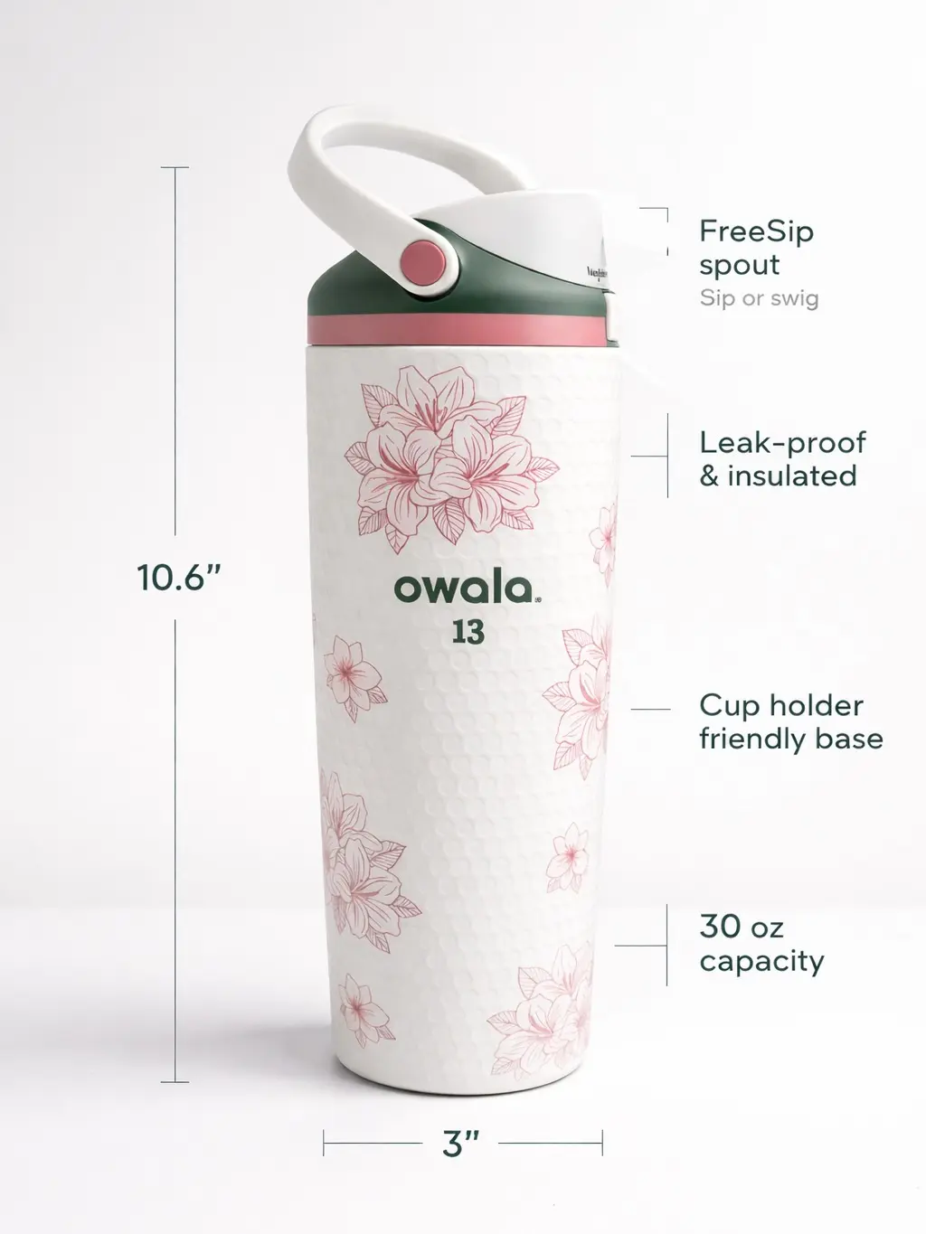 Elevate your daily hydration with the Owala Azalea 13 FreeSip 30oz Water Bottle. This floral print tumbler is perfect for travel and daily use. Its leakproof design ensures convenience, while the insulated stainless steel keeps your drinks at the ideal temperature.