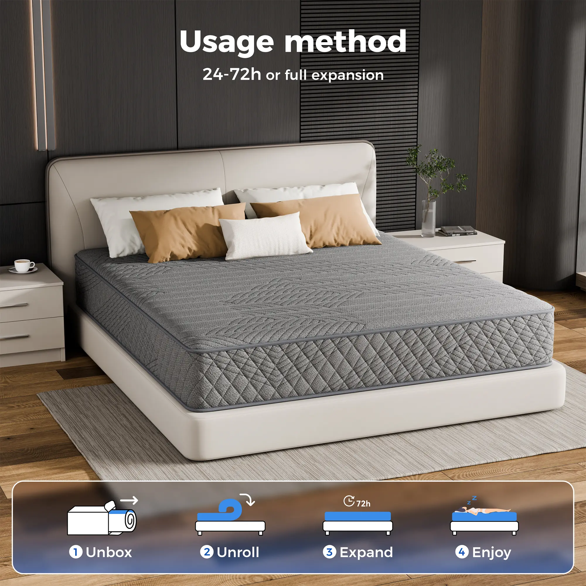 Worry Free Purchase - Enjoy a 100-night trial and a 10-year warranty with mattress. We are committed to providing you with the best sleep experience through our high-quality products. If your mattress is defective or damaged during shipping, our customer support team will address any concerns you may have.Please allow 24 to 72 hours for the mattress to fully expand and regain its shape.