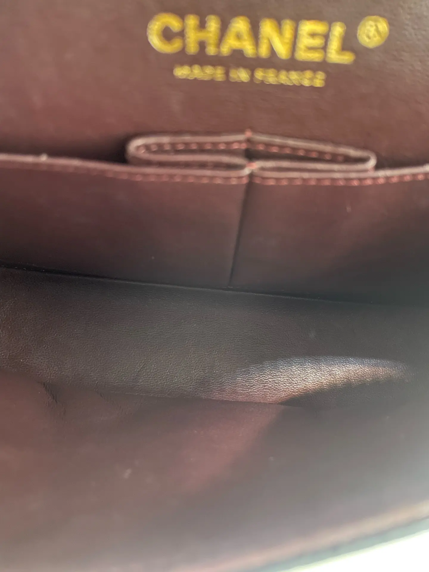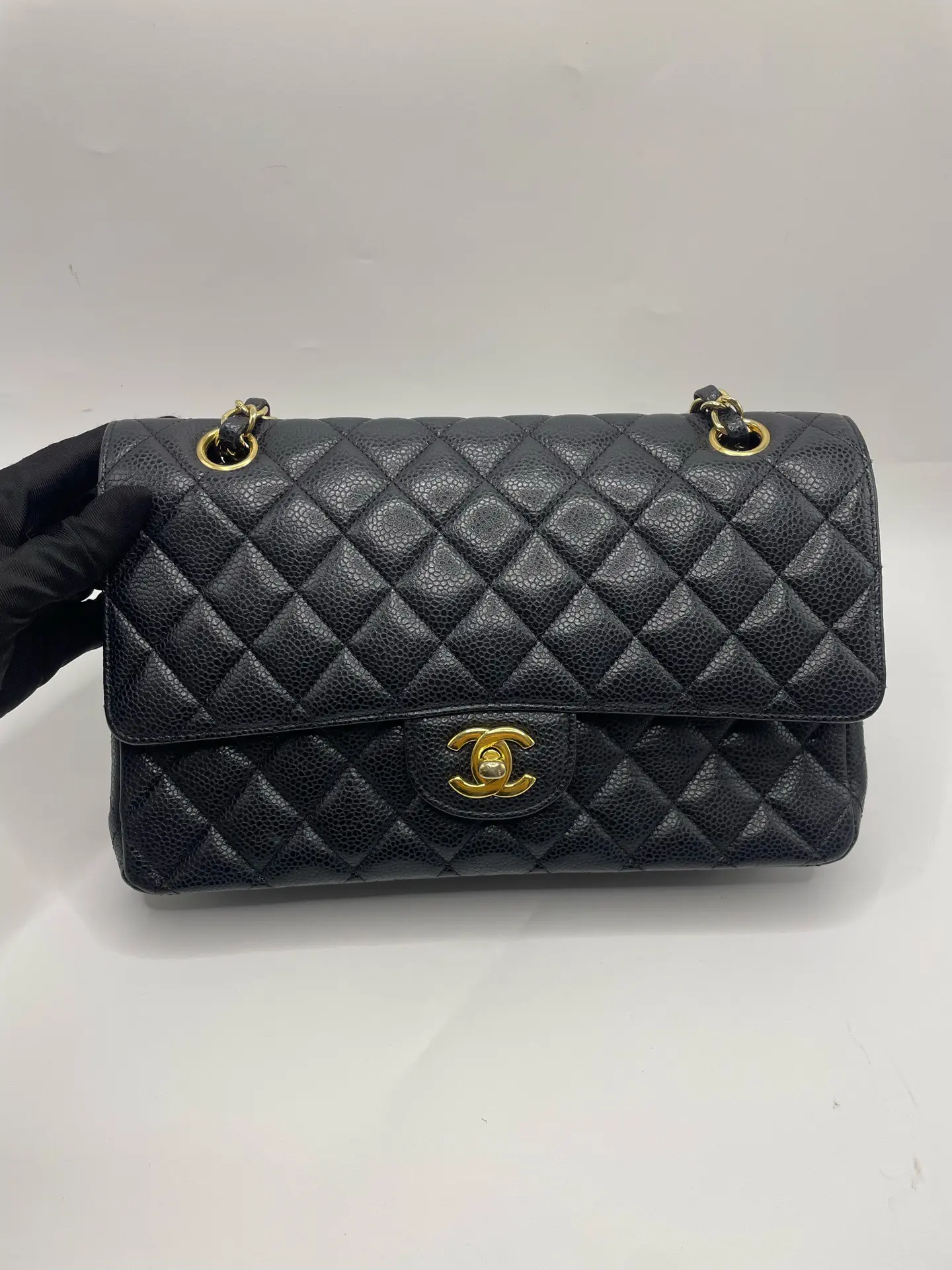 Pre-owned CHANEL Classic Flap Small – Black Caviar Leather with Gold Hardware. Series 19 (2014) Shows normal signs of use. Classic double flap with signature quilted pattern. Size: 15.5 × 25.5 × 6.5 cm.