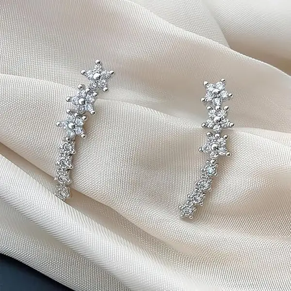 3D Flower CZ Climbing Earrings, Sparkly Crystal Crawler Ear Jackets, Lightweight Silver Plated Fashion Jewelry for Daily & Special Occasions