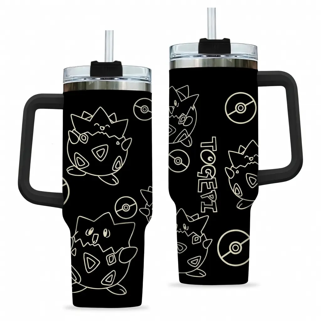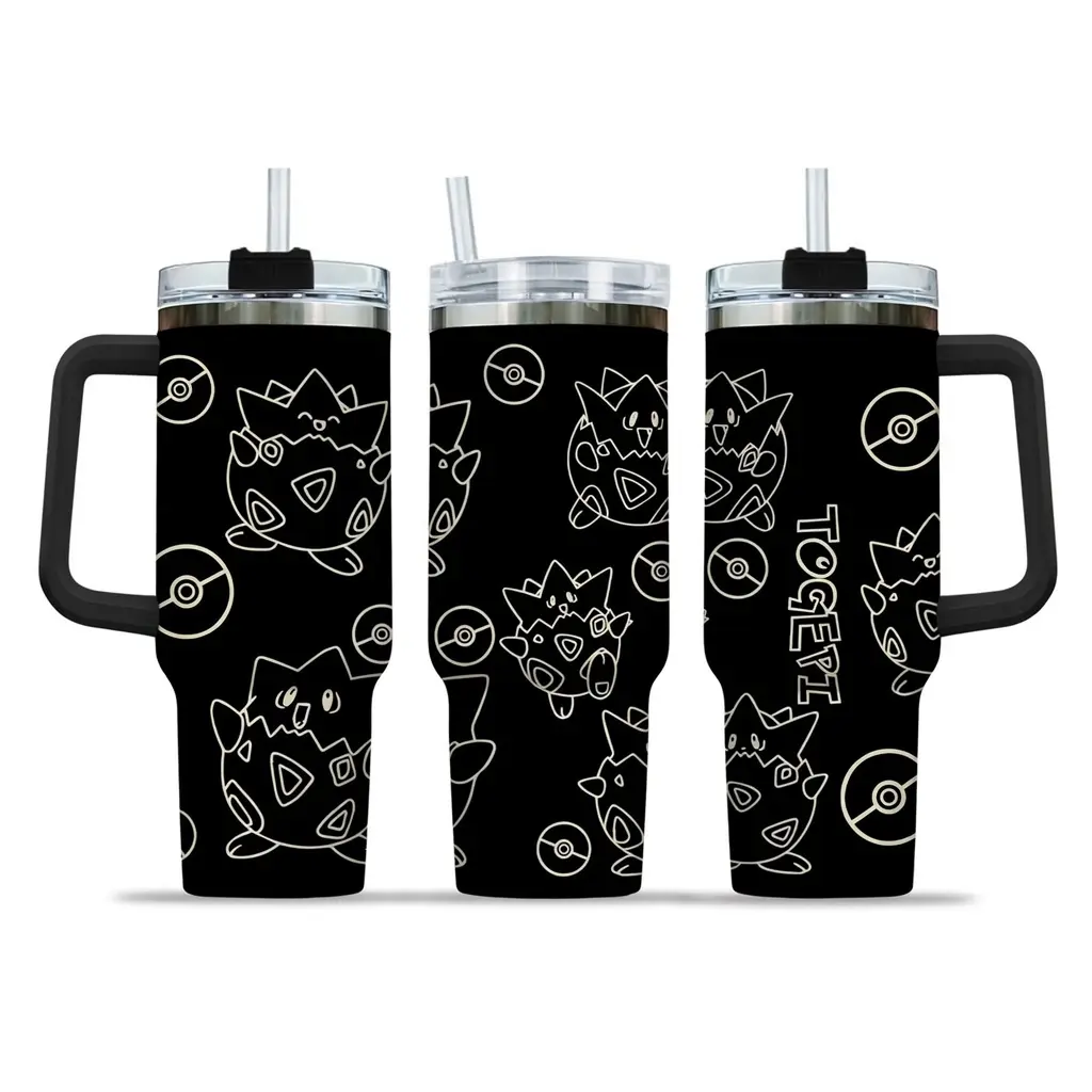 Togepi 40oz Tumbler with Handle and Straw, Stainless Steel Vacuum Insulated Cup, Pocket Monster Design, Anime Merch, Anime Tumbler