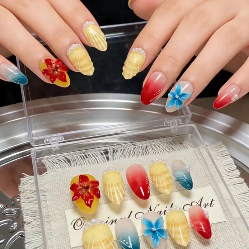 ◆ Elegant Design: Medium almond shape with blue red ombre gradient, 3D flower & shell details, perfect for summer vacation, beach party, date, daily wear and photoshoots.