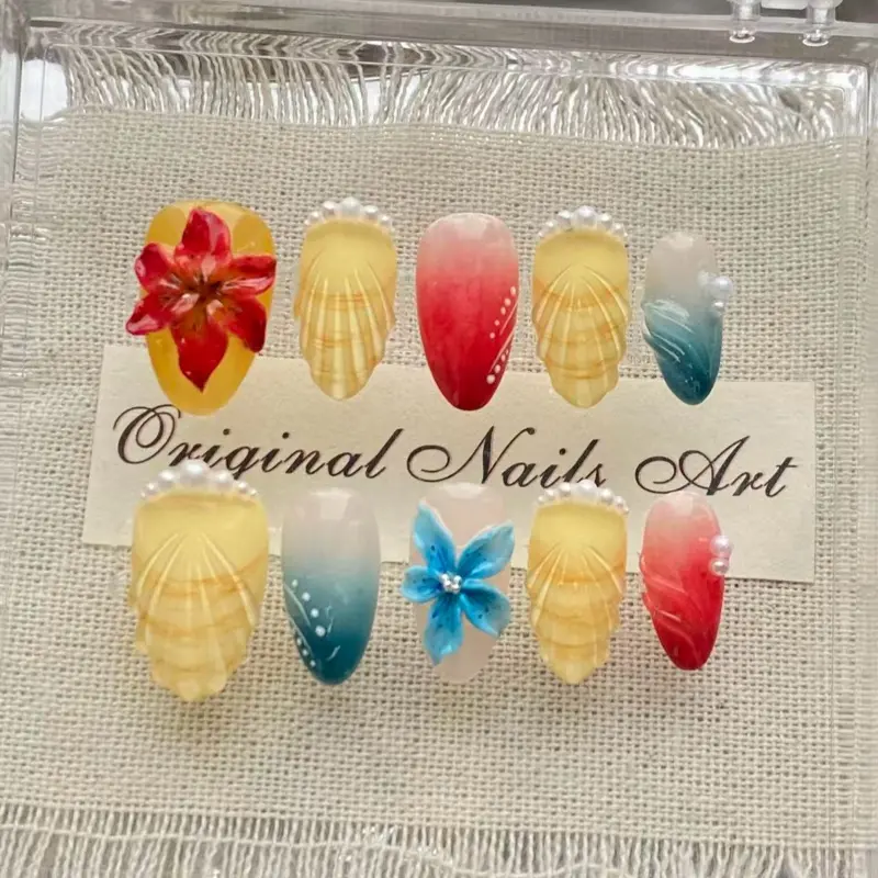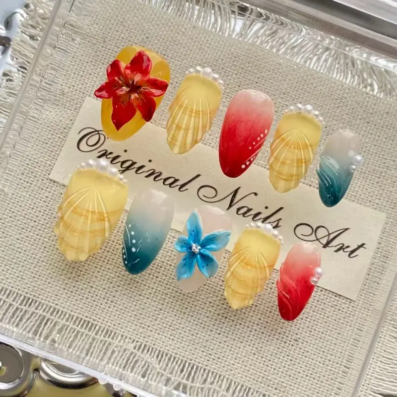 Elevate your nail game with our stunning blue red ombre shell press-on nails, featuring elegant 3D embossed flowers and shell texture accents!