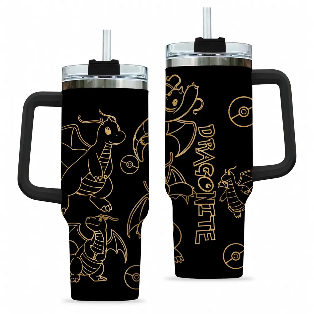 Dragonite 40oz Tumbler with Handle and Straw, Stainless Steel Vacuum Insulated Cup, Pocket Monster Design, Anime Merch, Anime Tumbler