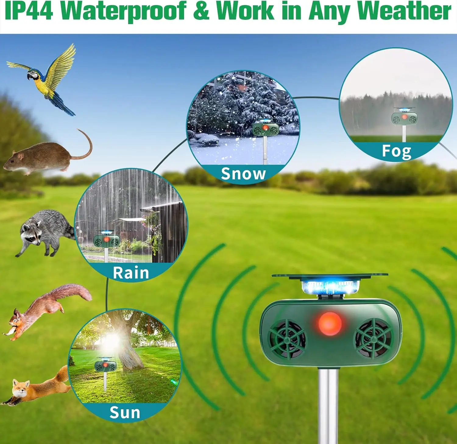 SAFE & EASY to USE: This solar animal repeller is harmless,eco-friendly.Ultrasonic waves cannot be heard by human, only animals will be influenced.It is designed to repel animals with ultrasound, alarms and bright light. No harm, very humane.This animal deterring devices is easy to use and set up. You just need to put it in the soil in a sunny spot and enjoy the environment undisturbed by intruders