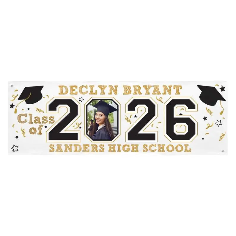 Make It All About Them Caps off, it's their moment! This banner isn't just decor; it's their spotlight. Slap on their name (up to 18 letters), the big year, their school, and yes—even their actual photo—so everyone knows who the star of the day is. It's a personalized mic-drop moment for your grad