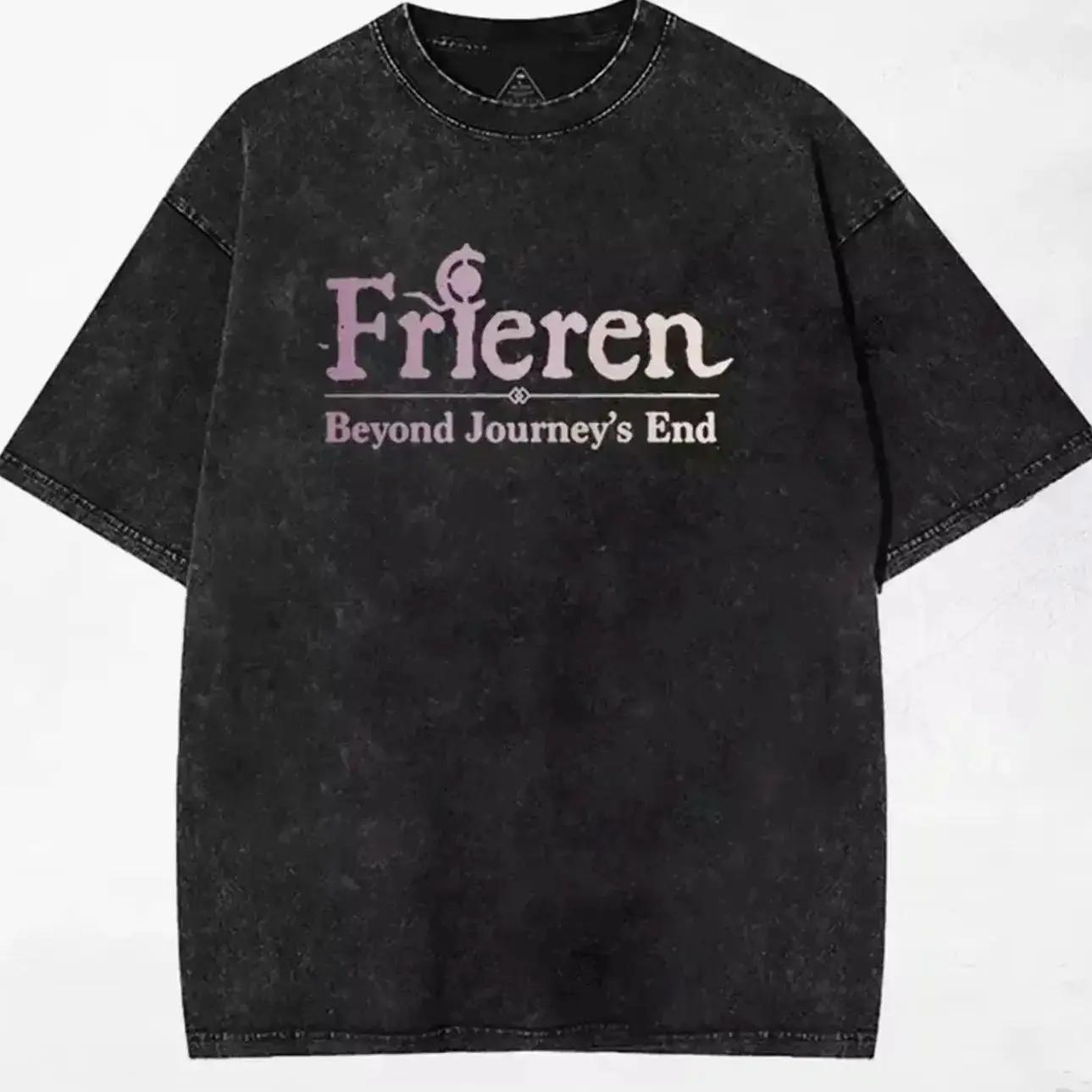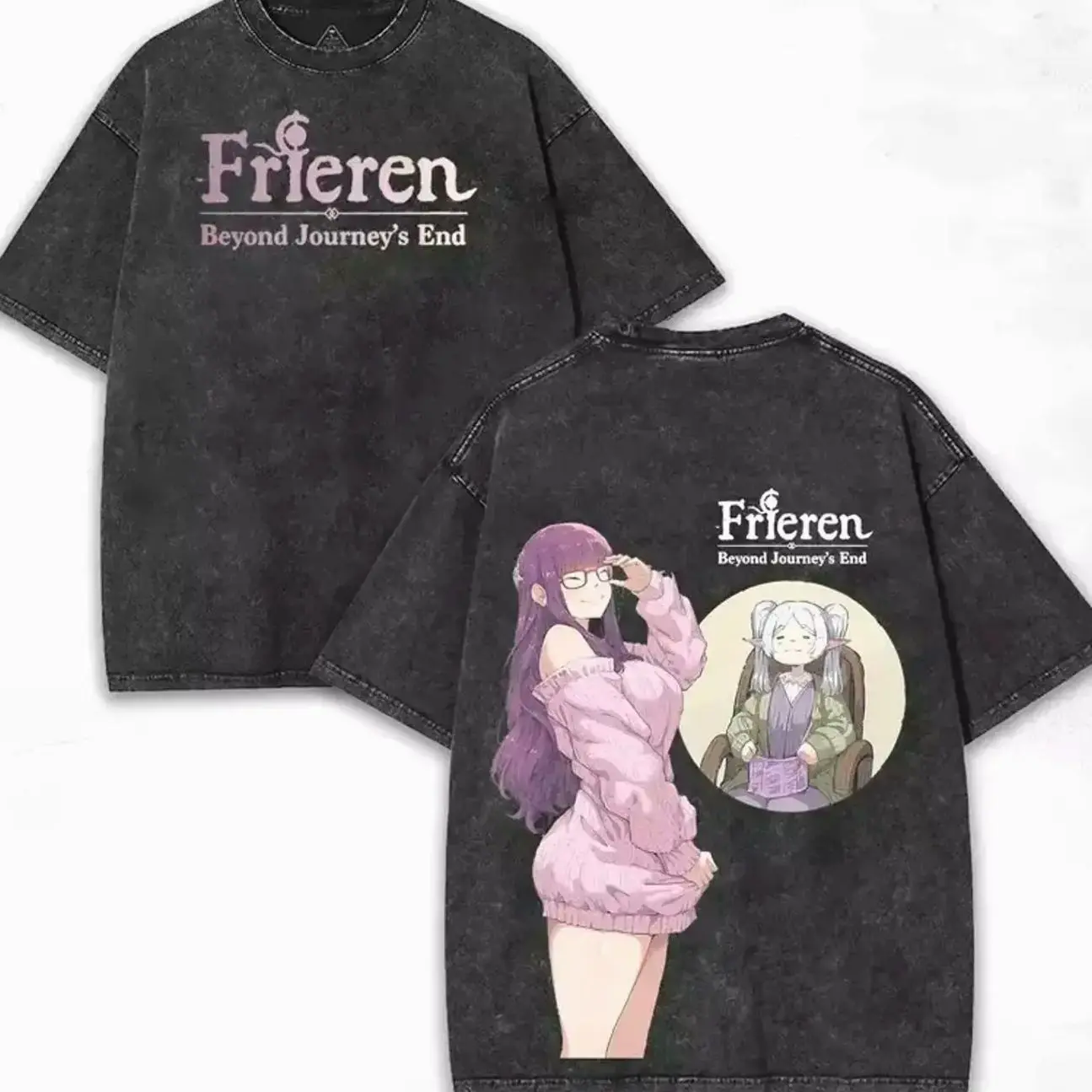 Frieren Beyond Journey's End Anime Fern T-shirt For Men's Clothing Vintage Washed Unisex T Shirt Short Sleeve Cotton Tees Top Retro Double-Sided Water Wash T-Shirt 5ZT
