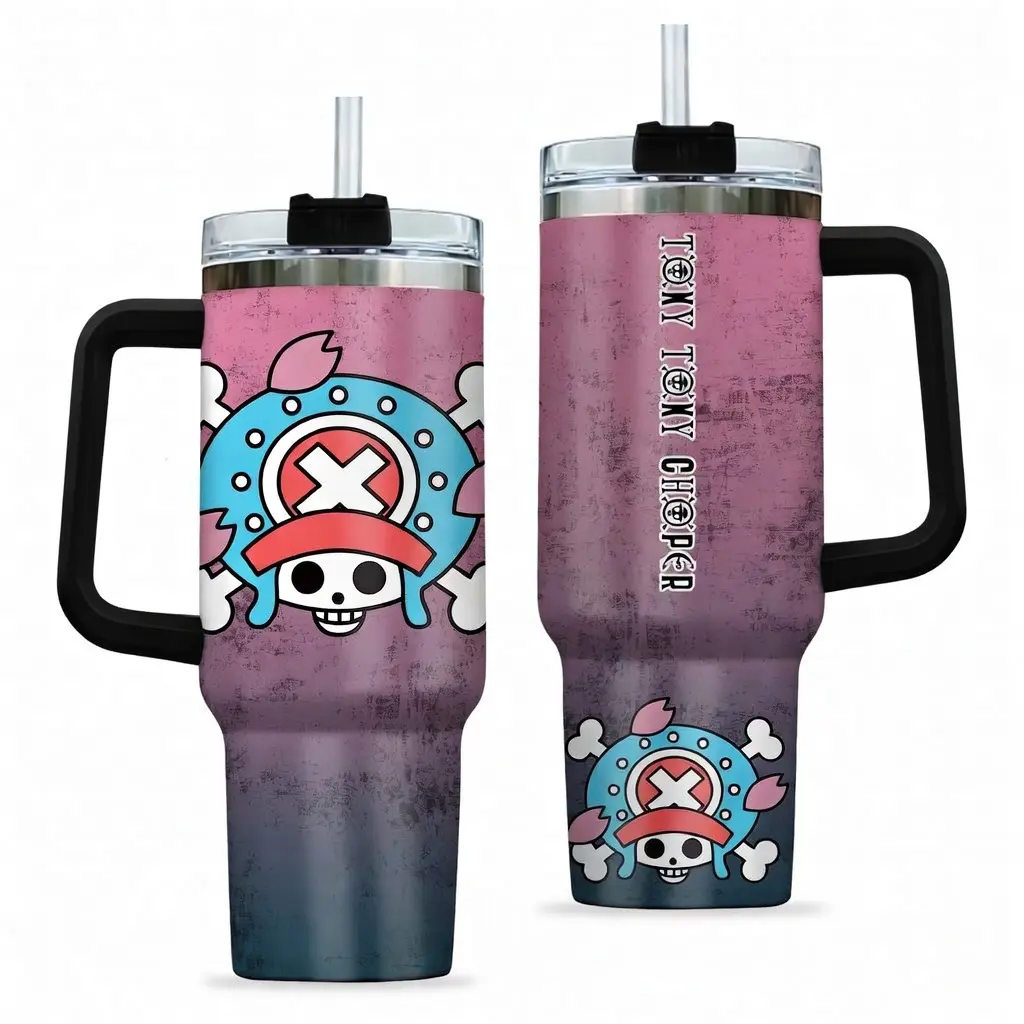 Tony Tony Chopper 40oz Tumbler with Handle and Straw, Stainless Steel Vacuum Insulated Cup, OP Jolly Roger Skull Design, Anime Merch, Anime Tumbler