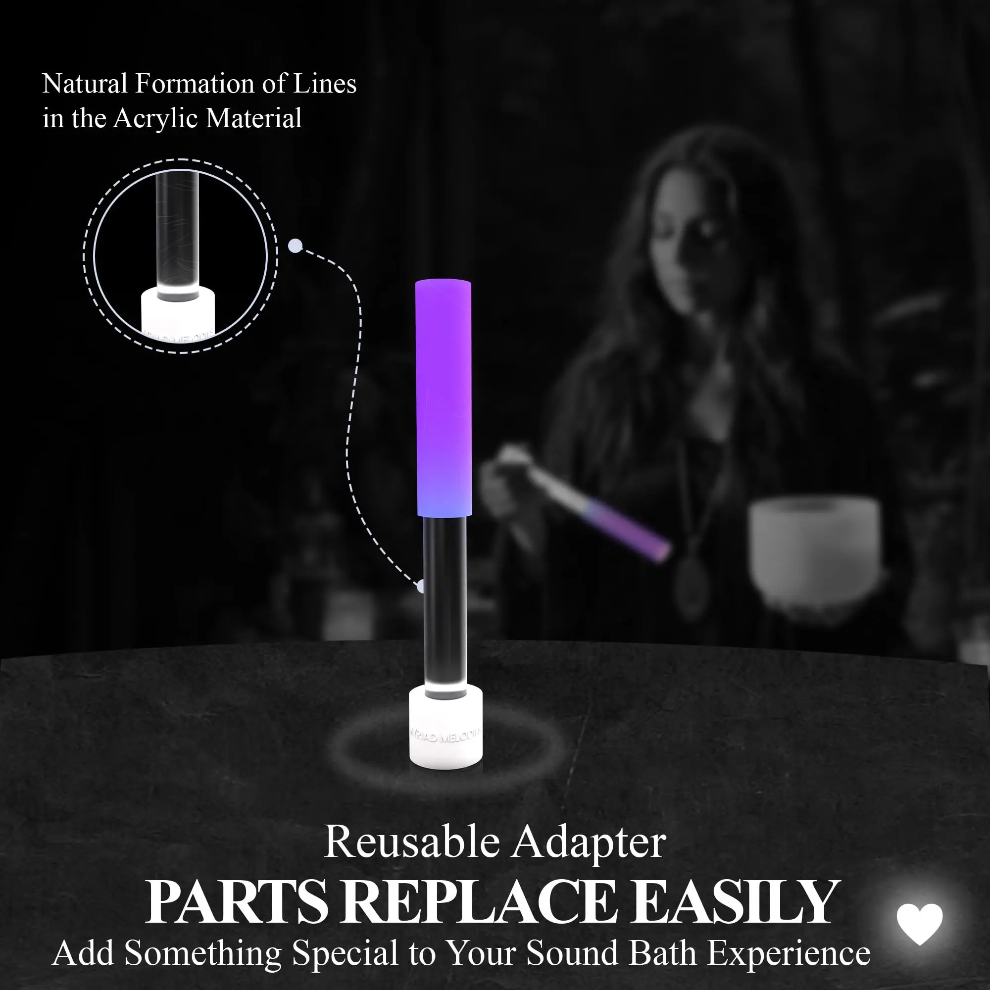 Myriad Melodies' Light Up Acrylic Strikers are a vibrant addition to your sound therapy practice, infusing the energy of color and wavelength into every session. Designed for functionality, these strikers effortlessly produce resonance with all crystal singing bowls, including bowls that are sometimes difficult to play, like the 528 Hz and High C note bowls. This crystal singing bowl accessory has a rich, earthy sound, comparable to suede strikers. While the acrylic striker may feature uneven lines where the outer material wraps around the handle, this does not detract from their beauty or performance. Each striker comes with a Light Up adapter, allowing you to create captivating visual experiences during performances or meditation sessions. Choose a colorful acrylic striker that resonates with your energy and enhances your practice. Purchase today and transform your sound healing experience!