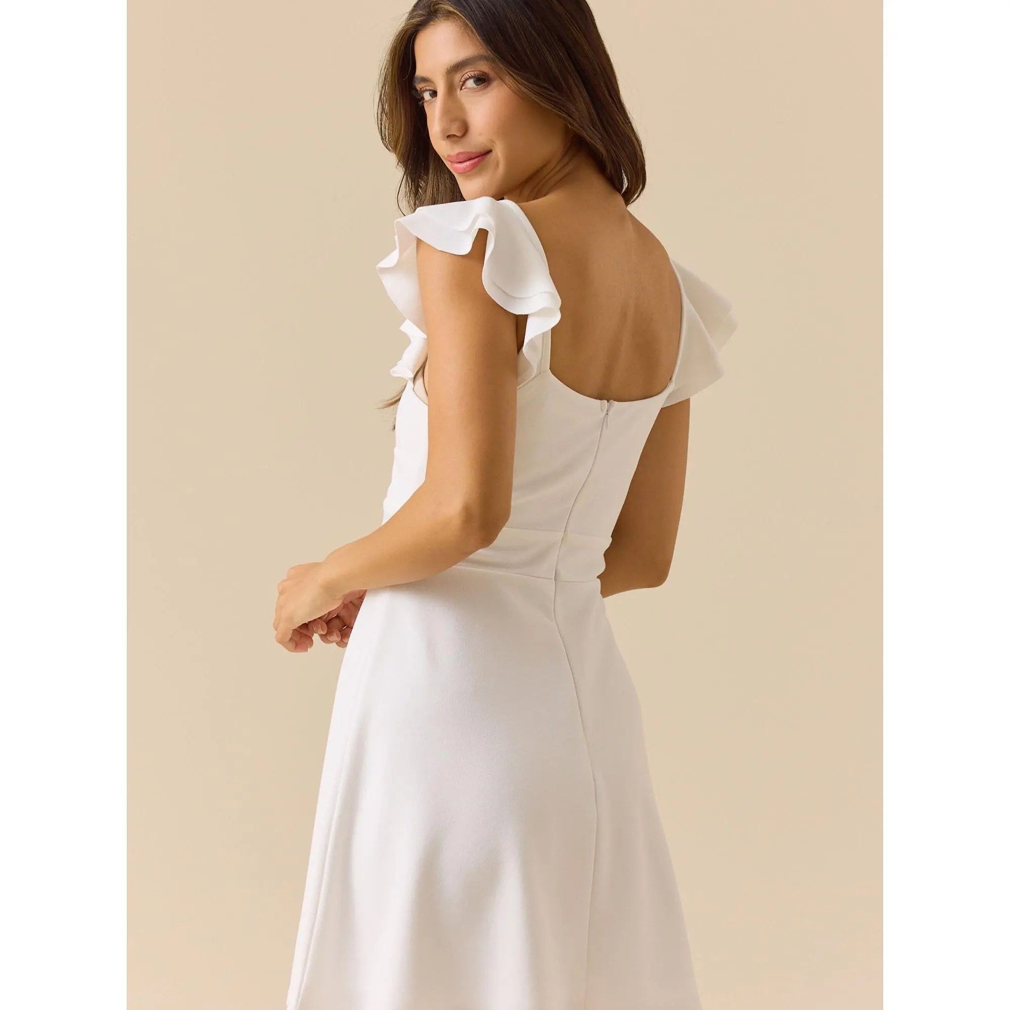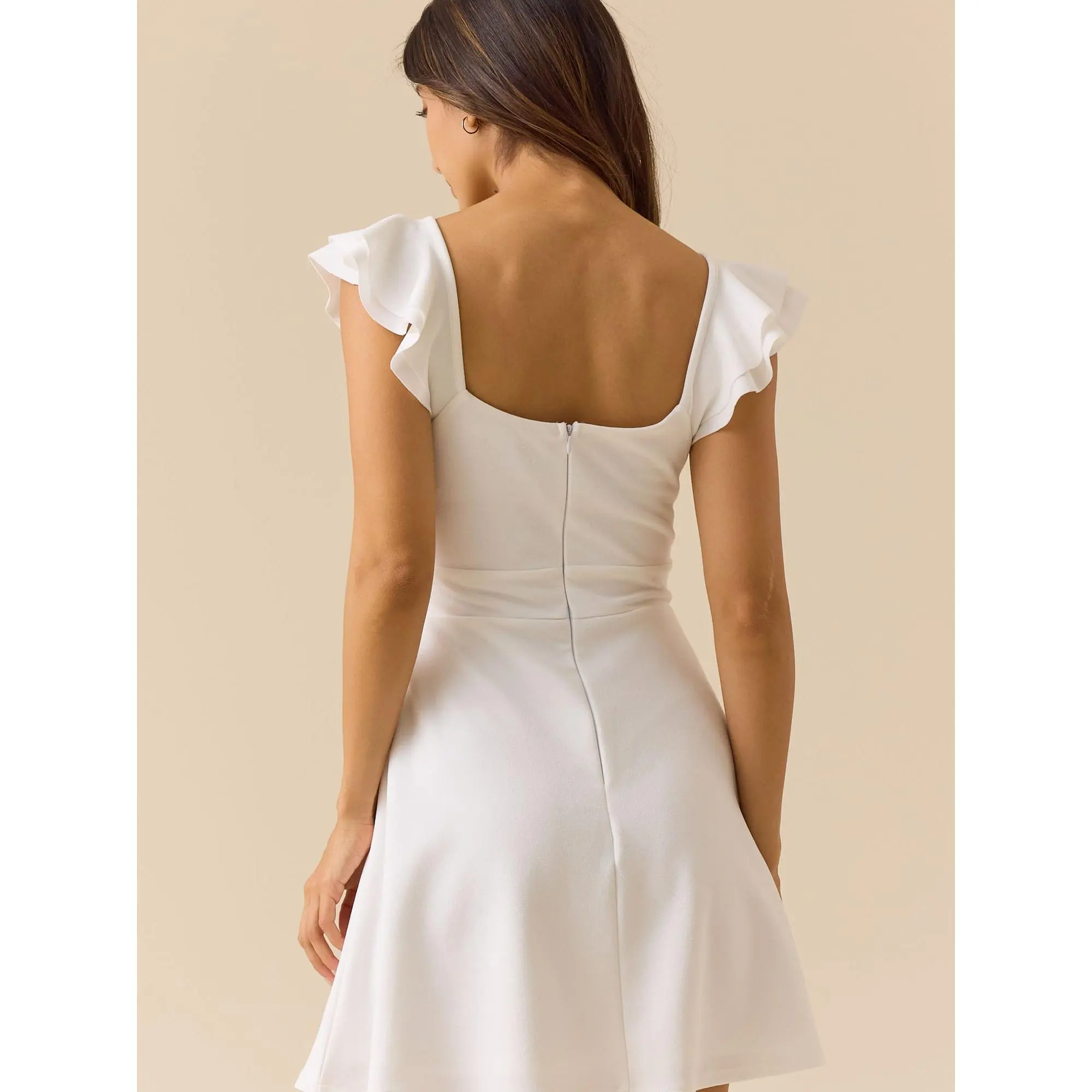 This mini dress is crafted from soft, lightweight fabric and features delicate flutter sleeves for a feminine touch. A twist knot detail adds subtle texture and shape, creating an effortlessly polished look for any occasion.