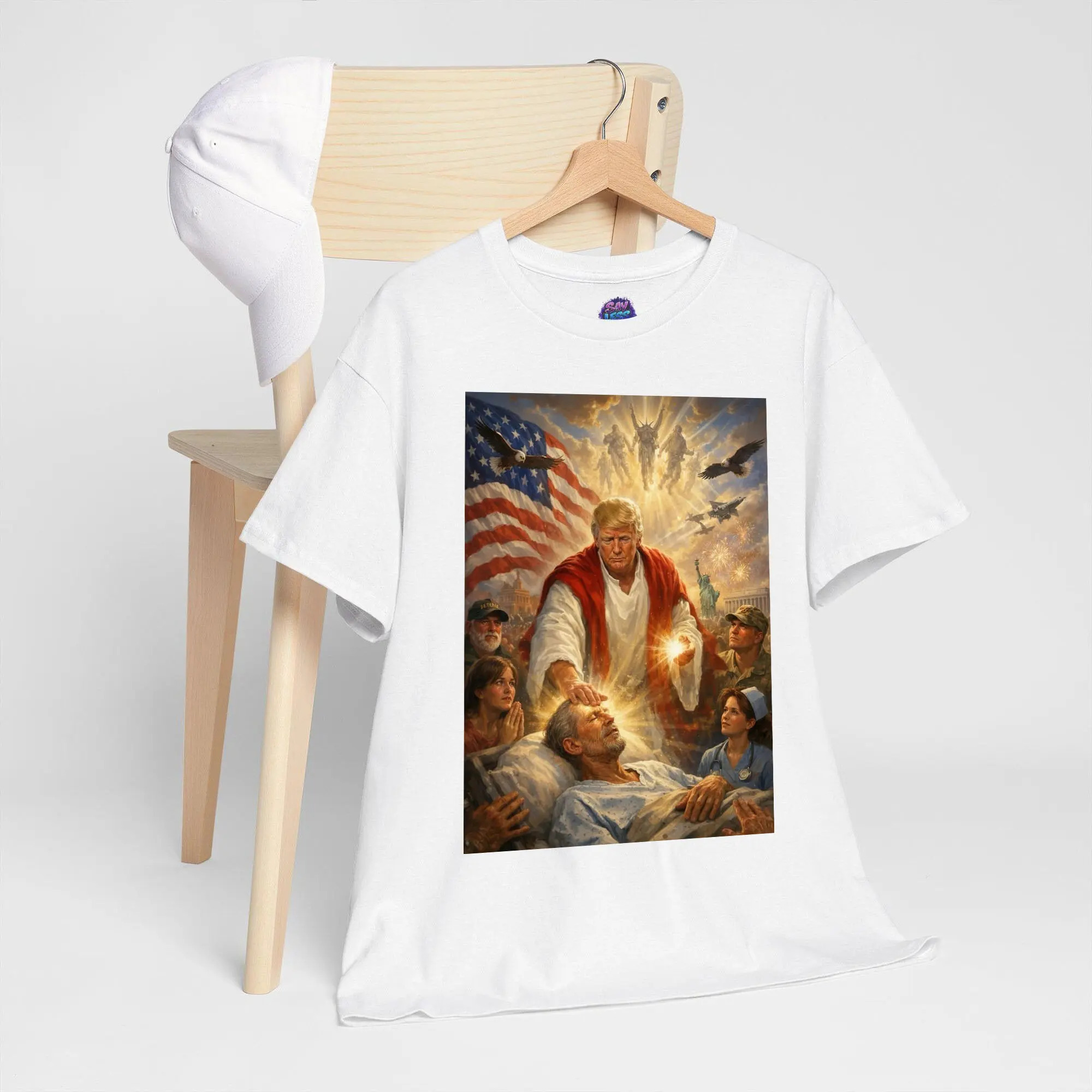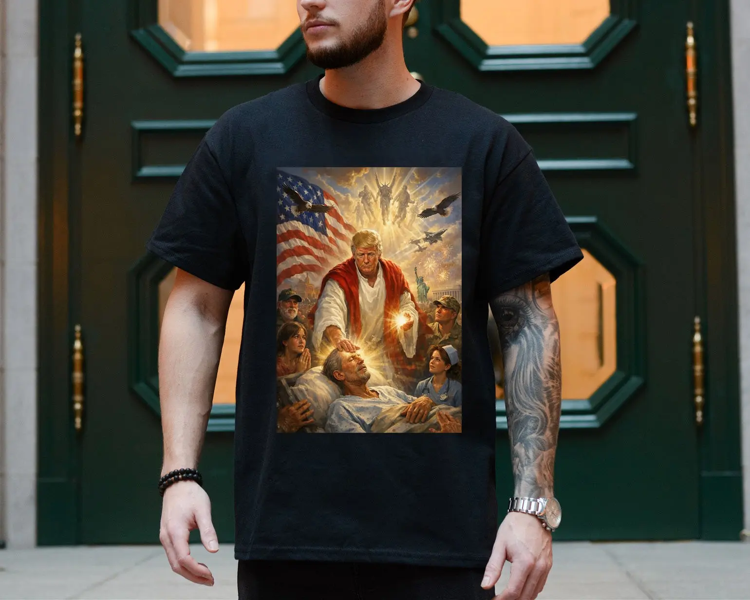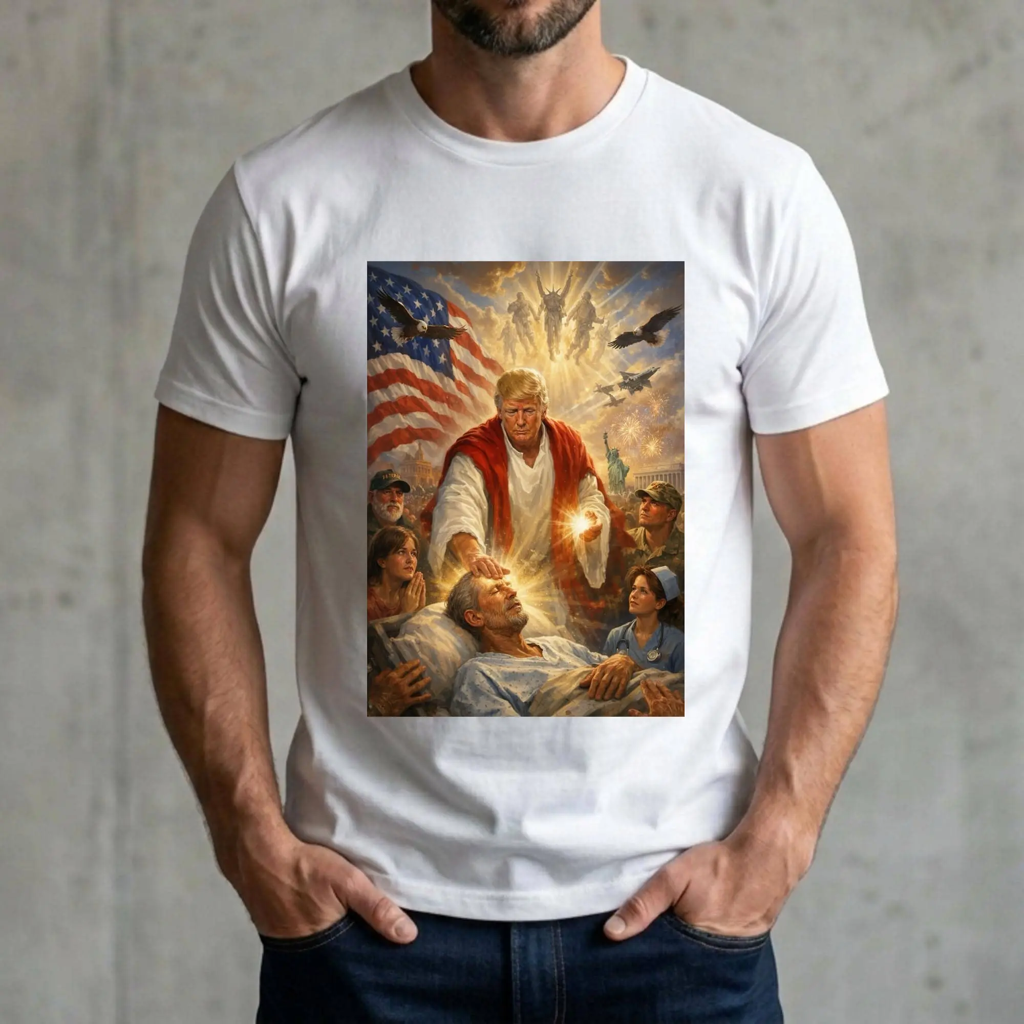 Trump Jesus Humor T-shirt, Leader Healing Scene With American Flag Angels And Soldiers Tee, Trump Jesus Meme Shirt, Funny USA Patriotic Shirt