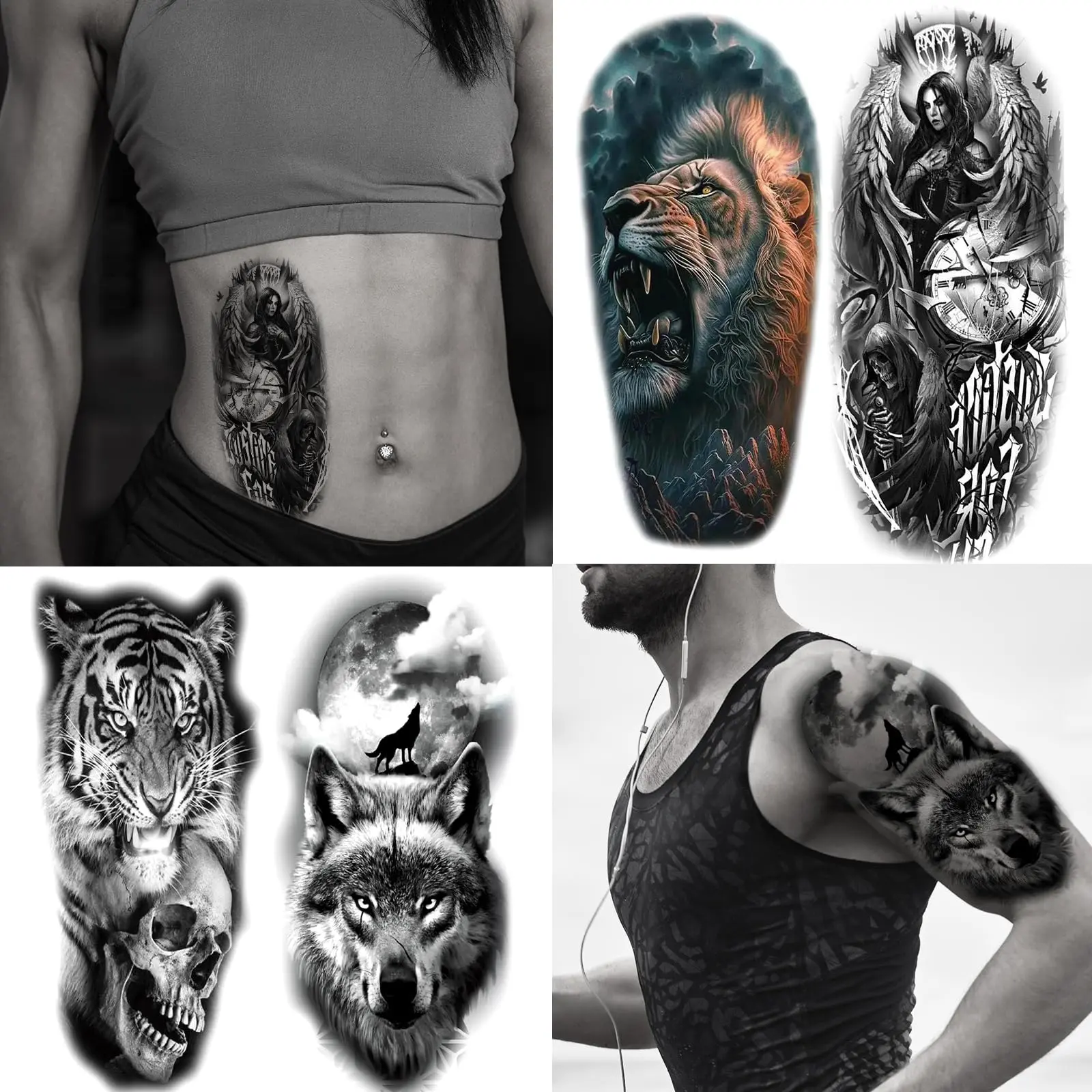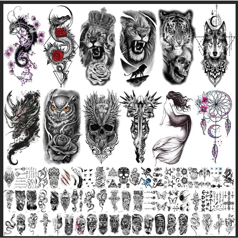 72 Sheets Temporary Tatoo 12 Large and 60 Medium-sizedsheets Black Arm Temporary Tattoos For MenForearm WomenThigh, Half Sleeve Temporary Tattoos,Halloween Tattoos Scary Lion Wolf Tiger Skull SkeletonTattoos Stickers