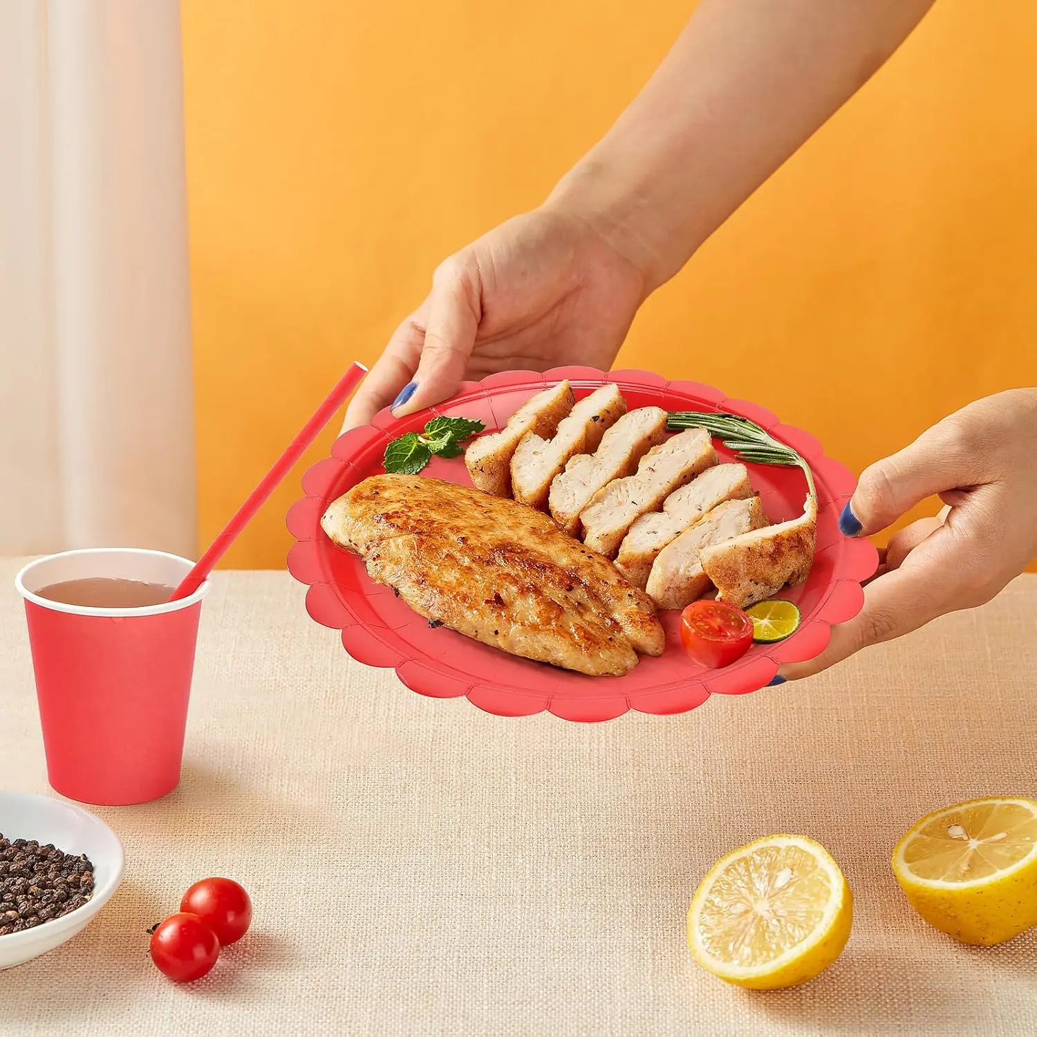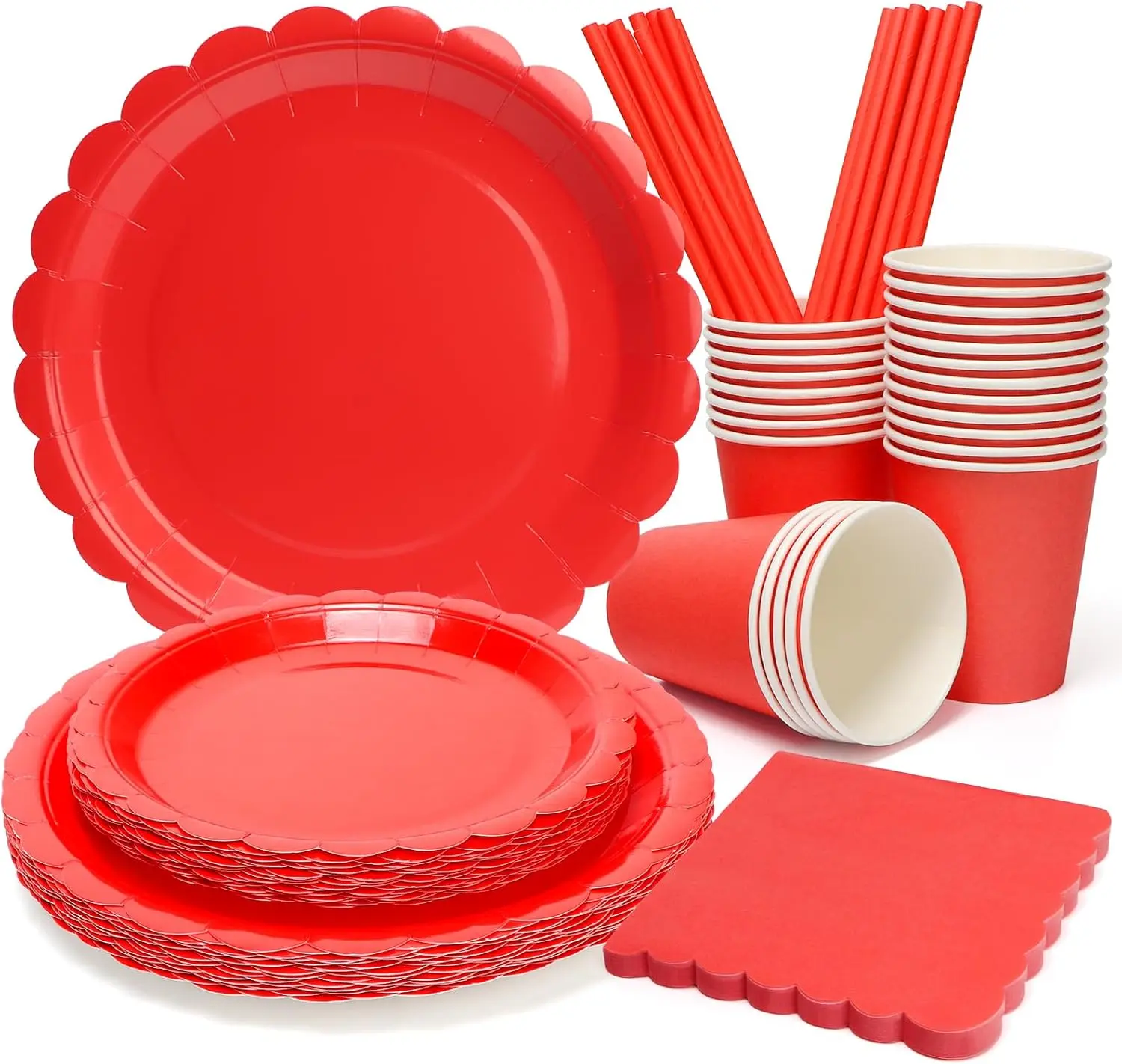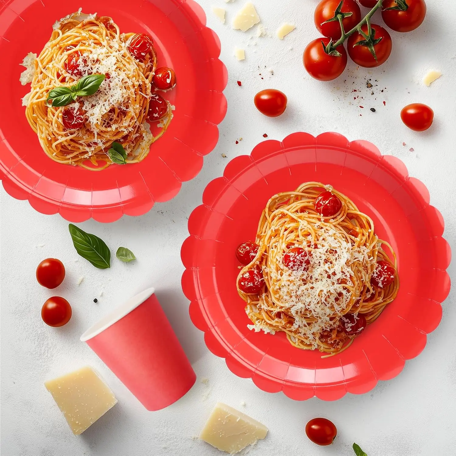 ·Red Scalloped Color Theme: Features a vibrant red color scheme with scalloped edges that adds a festive and sophisticated touch to your table setting, making your event memorable and visually appealing