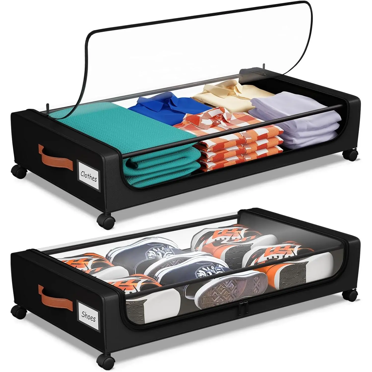 Under Bed Storage with Wheels, UnderBed Storage Containers with Clear Lid and Handles, XXL 60L Under the Bed Storage Bins Drawers for Clothes,Blankets,Shoes,Books (BLACK, 2 PACK)