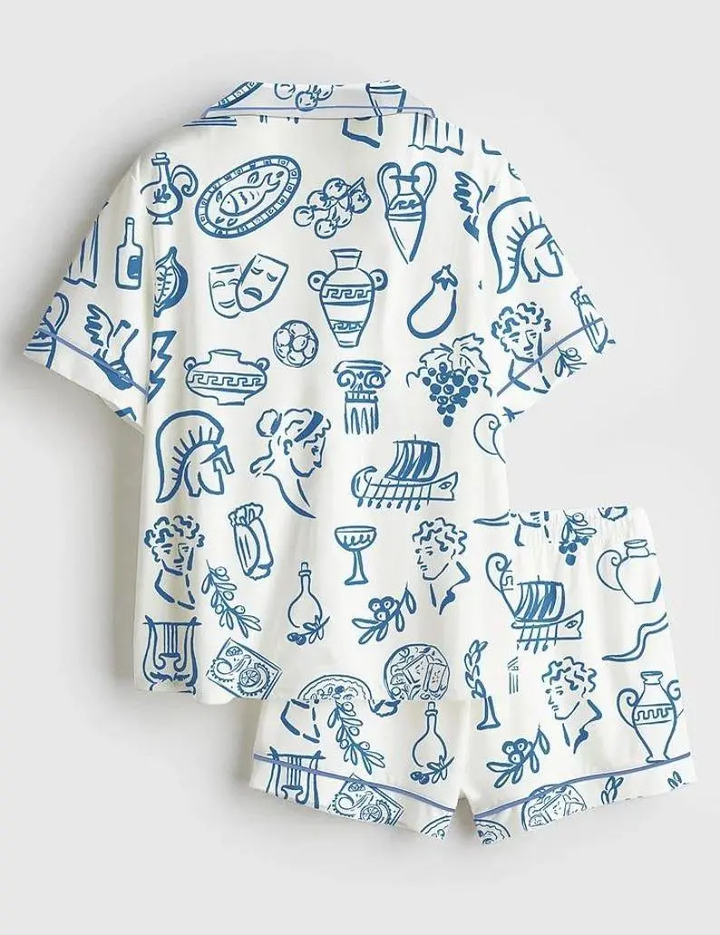 Hand Drawn Greek Food Satin Short Pajama Set, Greece Wedding Short Pajamas, Matching Family Sleepwear Set, Pajama Set For Women And Kids