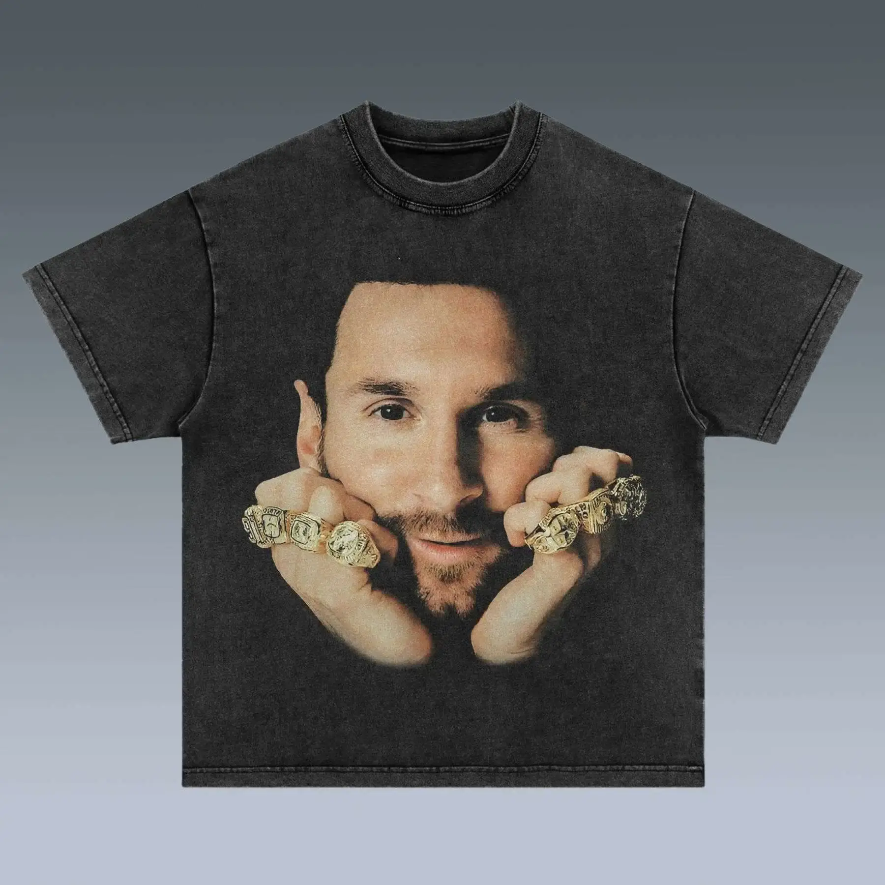 5. Messi Vintage Soccer Legend Portrait Graphic Tee Washed Black Oversized Retro Football Unisex Streetwear T Shirt
