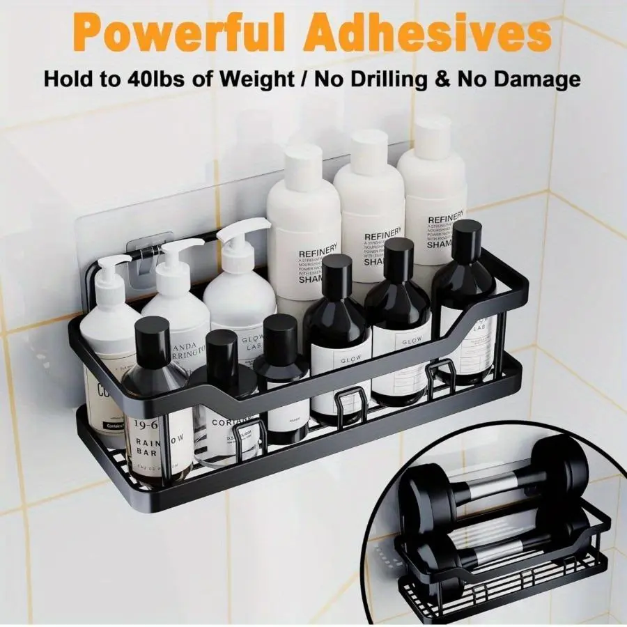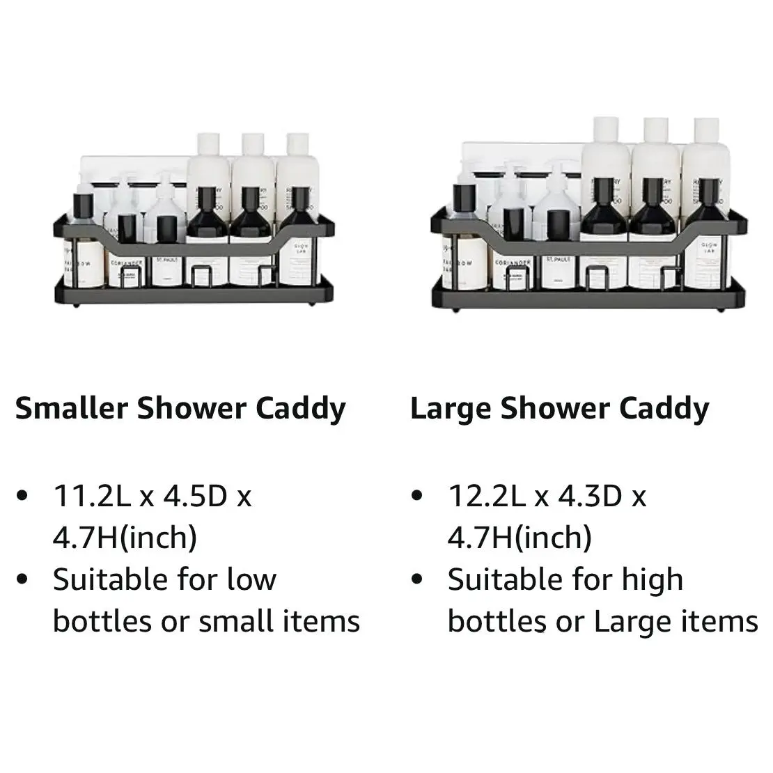 [STRONG ADHESIVES FOR STUDY MOUNTING] The adhesive is super sticky for flat wall surfaces and provides a strong hold for up to 40 lbs.The black shower caddy is ideal for holding Large & heavy bottles, such as gallon-size shampoo and shower gel, and other big items.The hooks help hang more shower supplies.