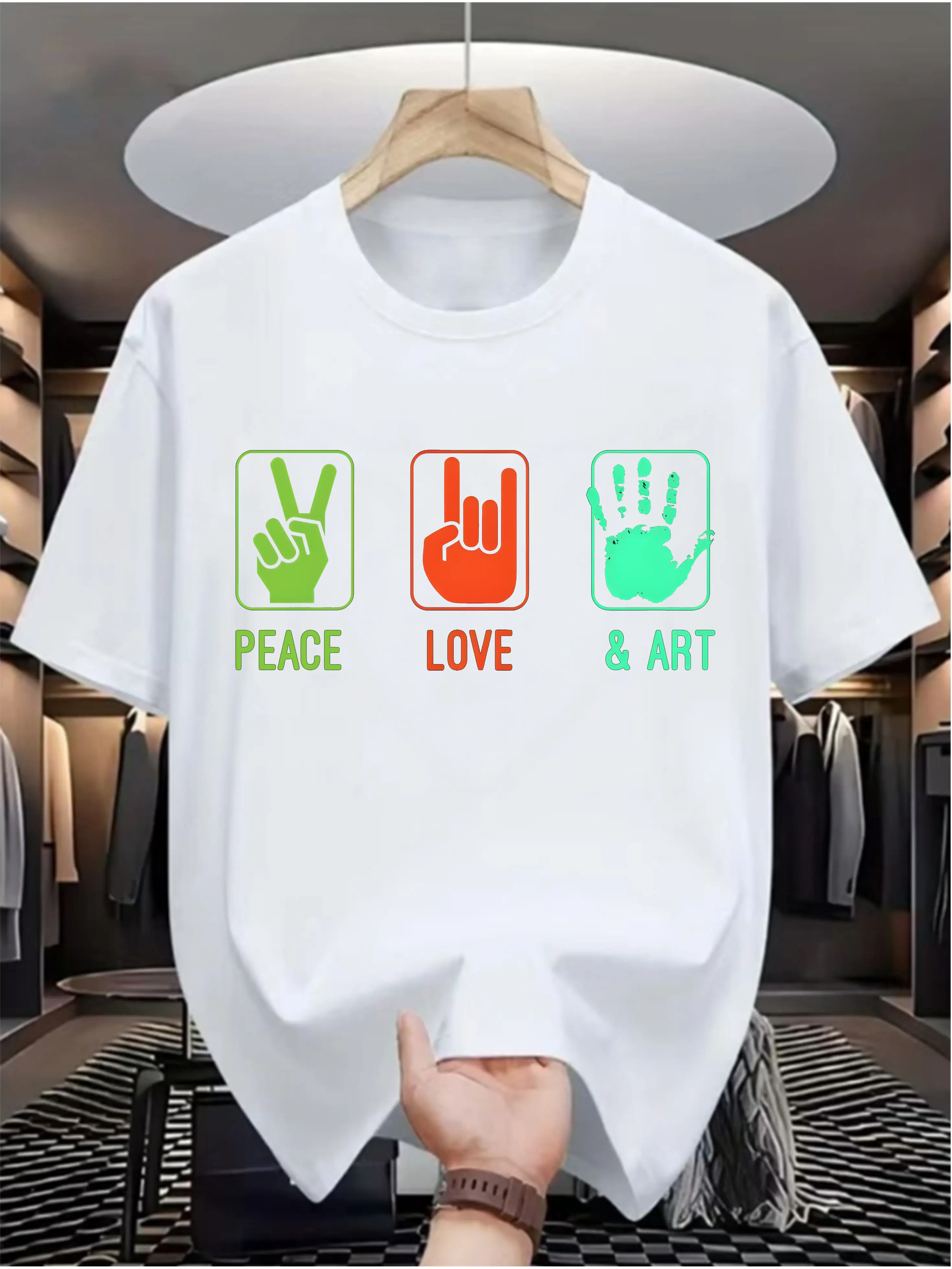 Men's peace, love, art Graphic T-Shirt - Short Sleeve Crew Neck Regular Fit Casual Wear | Soft & Breathable Fabric, Durable Print, Everyday Comfort, Machine Washable, streetwear, hip-hop, casual, modern fashion urban clothing store, fashion display,