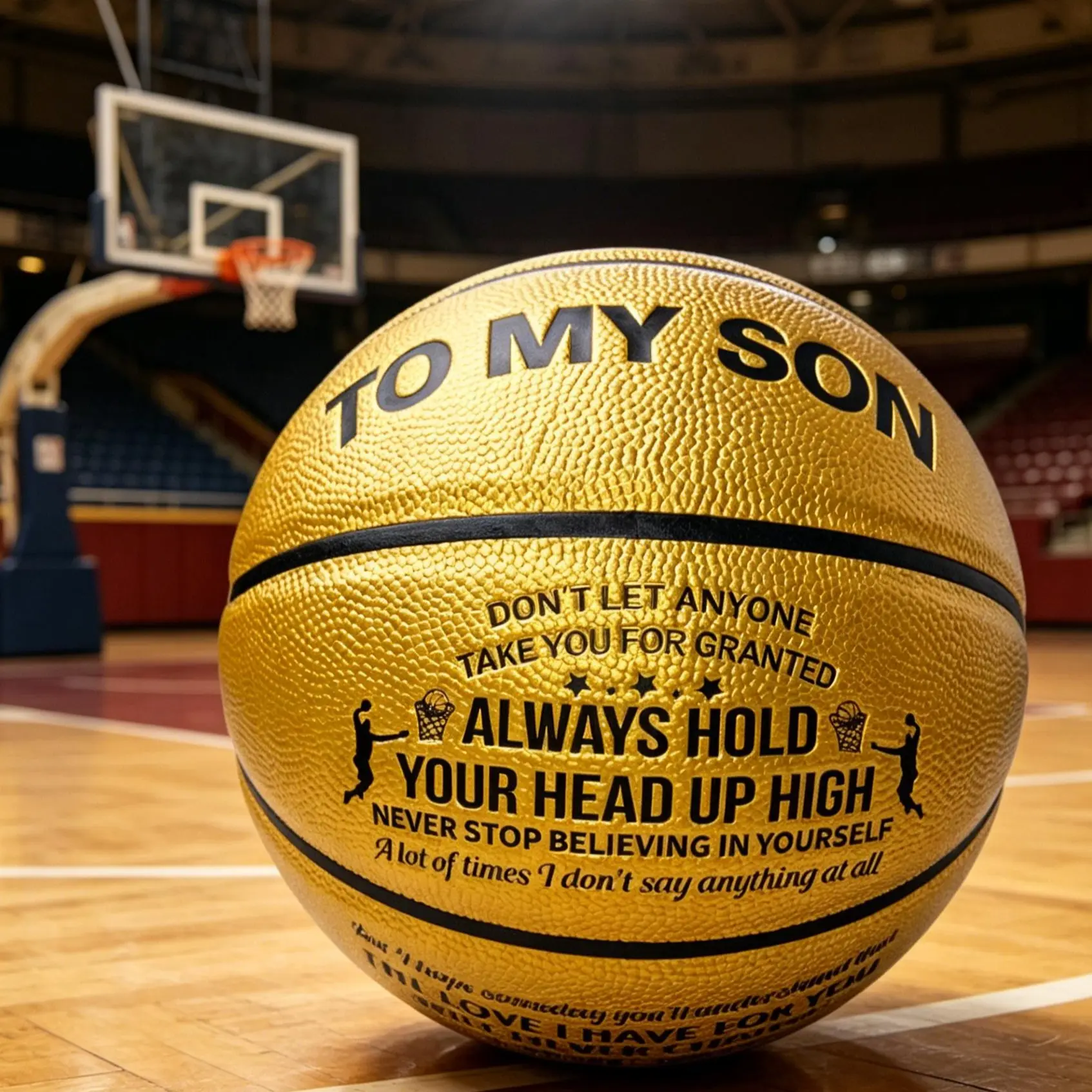 Engineered for real play, this ball delivers a superior non-slip grip, consistent bounce, and durable construction that stands up to both indoor gym hardwood and outdoor concrete courts. The stunning golden finish makes it a showstopper on the blacktop, while the meaningful message turns it into a lifelong keepsake he’ll treasure forever.