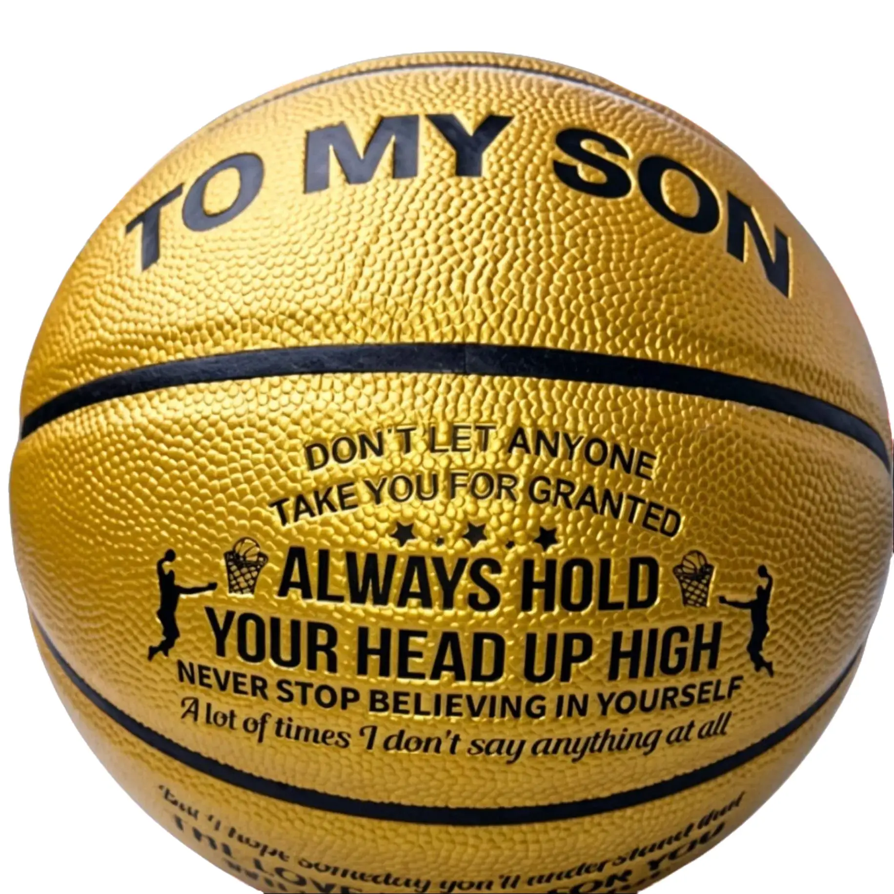 This isn’t just a game ball – it’s a heartfelt, engraved keepsake designed to inspire your son, on and off the court. Crafted with a premium golden pebbled leather exterior, this official Size 7 basketball features a powerful, hand-engraved message from a parent to their child: