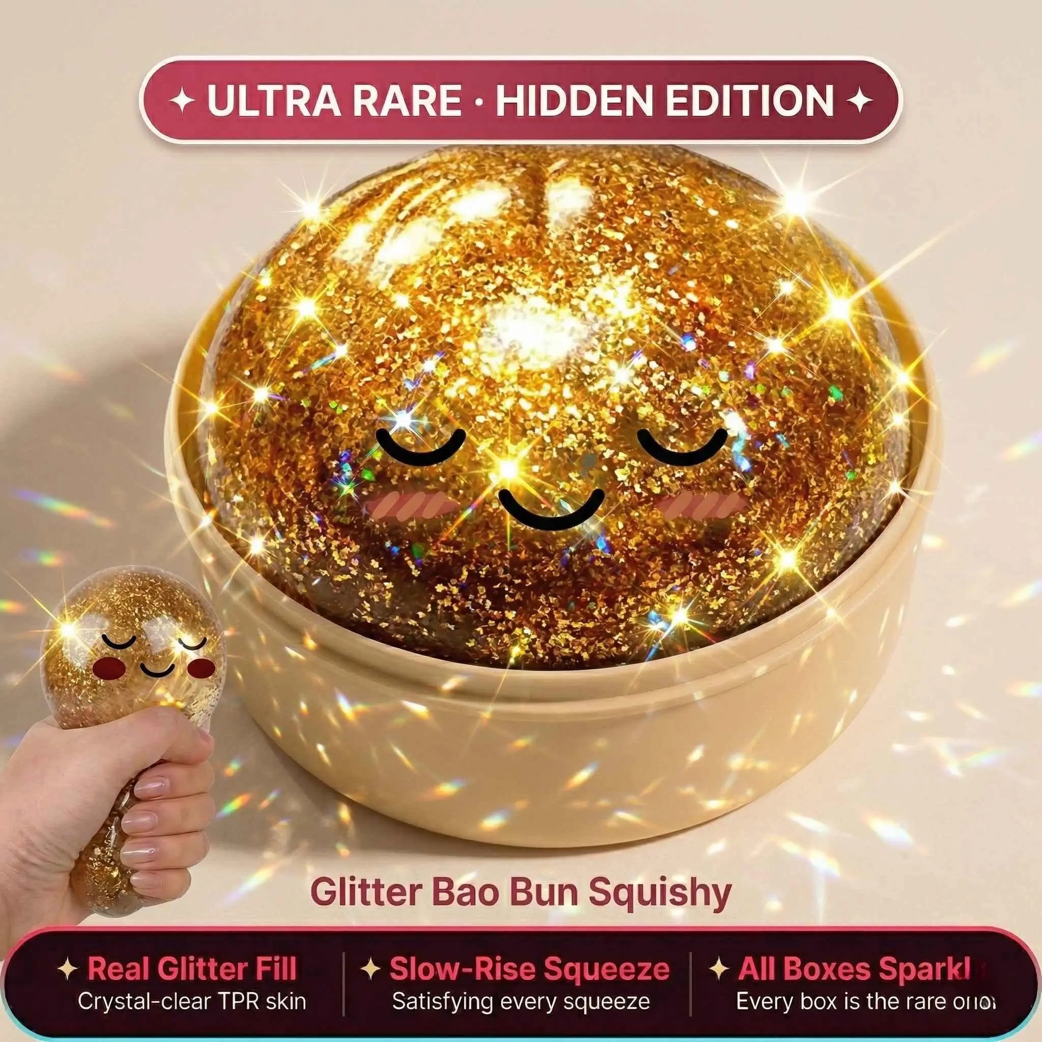You've seen the viral dumpling squishy on TikTok. Now, meet the gold one. Rarer. Shinier. More satisfying. This Gold Glitter Hidden Edition is a collector's dream. Selling out before most people know it's back. If you know, you know.