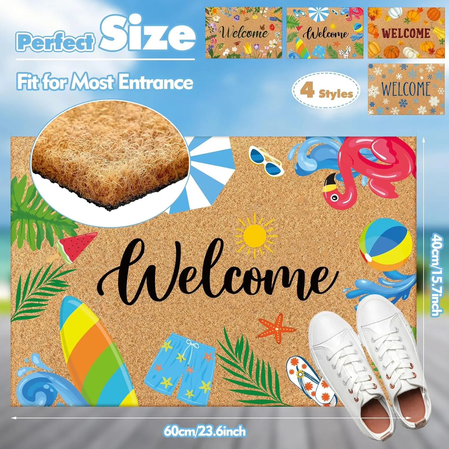 All Season Door Mat: you will receive four mats including spring, summer, fall and winter themes, our seasonal welcome doormat is 0.6 inch thick, measures 23.62 x 15.75 inches/ 60 x 40 cm, and has a TPR bottom for added stabilityInterchangeable Doormat: display the four seasons themed doormats in any outdoor entryway, enhancing the aesthetic appeal of your home's exterior while providing a clean and tidy entrywayEasy to Clean: the floral door mat is made from faux coco fiber that can easily be cleaned by shaking or sweeping away dirtThis doormat is waterproof, do not rinse it with water, just shake it open and retract it to dryIt is recommended to vacuum it occasionallyProtect Your Floors: this durable faux coir flower door mat will catch loose dirt and debris to ensure your shoes are clean when entering the house, providing an effective barrier to protect your floorsAdorable Designed Door Mat: elevate your front door the whole year with our inviting and decorative seasonal door mat, adding a touch of elegance and charm to your home's entranceThe color may exist a slight difference due to different screen displays.