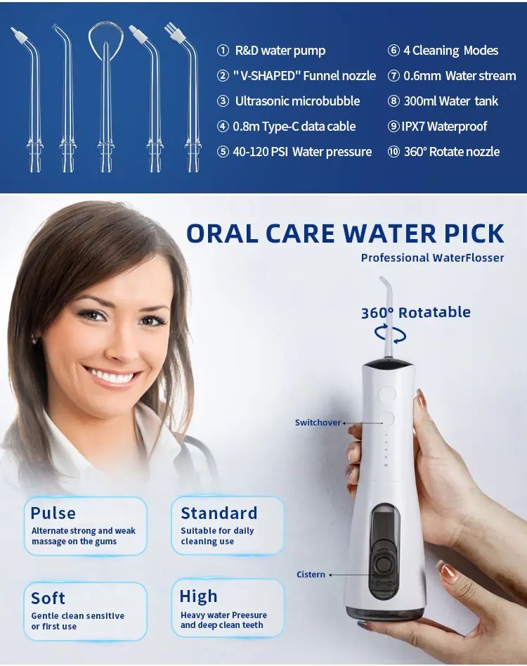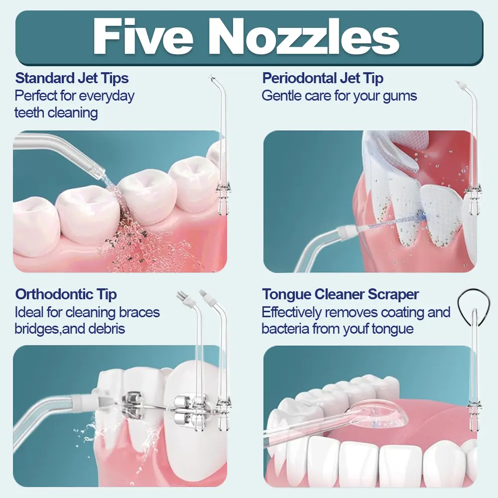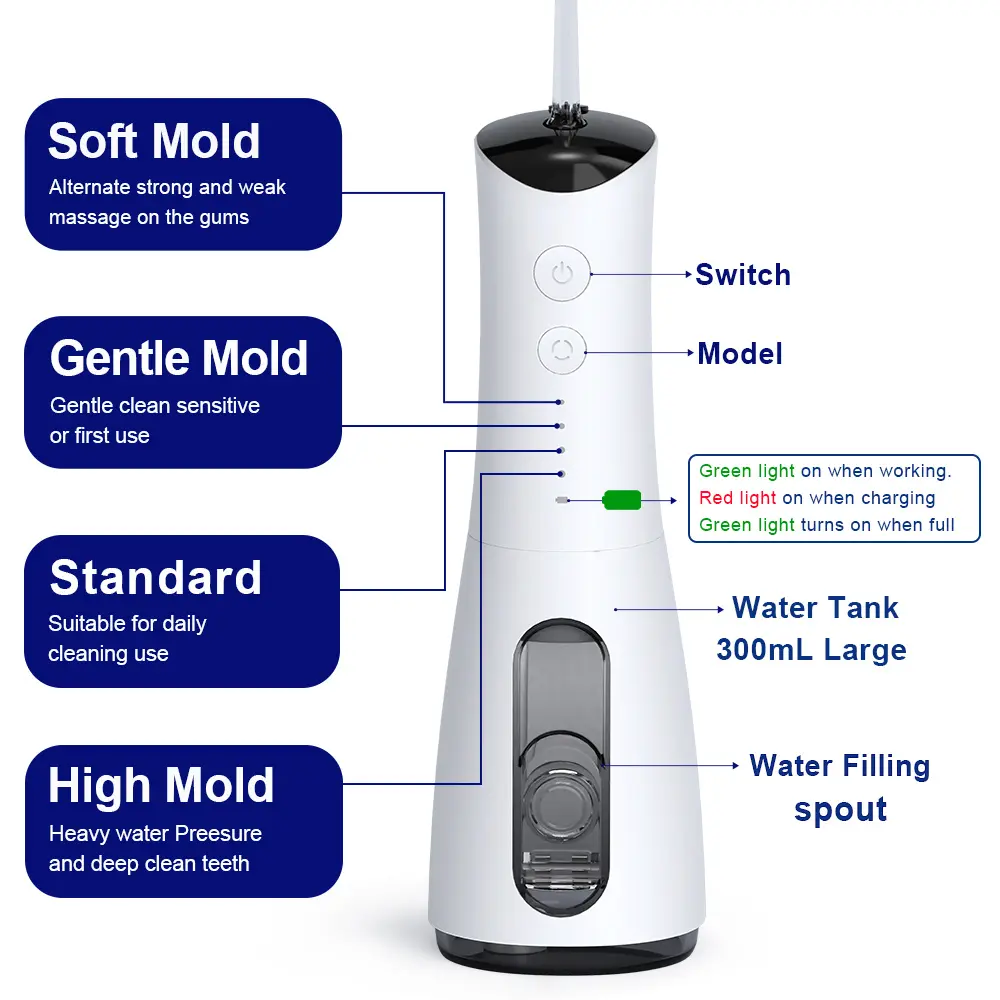 10-ounce (300-milliliter) large-capacity wide-mouth water tank for more convenient cleaning: Ample water supply allows for a 60-second full-mouth cleaning without needing to refill. The removable wide-mouth design makes cleaning and refilling easy, ensuring optimal hygiene