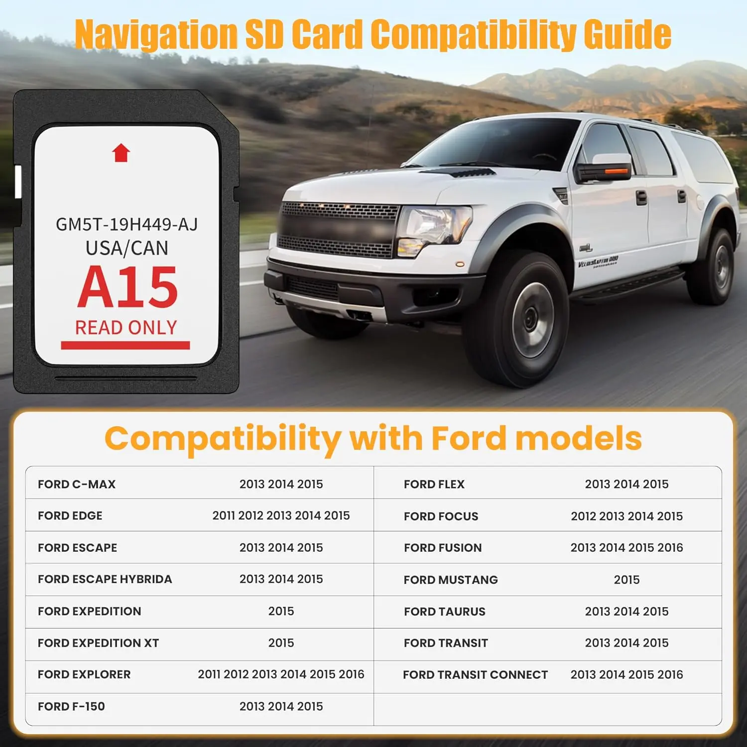 [WIDE COMPATIBILITY WITH FORD MODELS]This navigation SD card part number GM5T-19H449-AJ is designed to fit Ford vehicles including F-150 2013-2015, Explorer 2011-2016, Fusion 2013-2016, Expedition 2015, Escape 2013-2015, Edge 2011-2015, Focus 2012-2015, C-MAX 2013-2015, Escape Hybrid 2013-2015, Expedition XT 2015, Fiesta 2014-2015, Flex 2013-2015, Mustang 2015, Super Duty F-250/F-350/F-450 2013-2016, Taurus 2013-2015, Transit 2013-2015, Transit Connect 2014-2016.