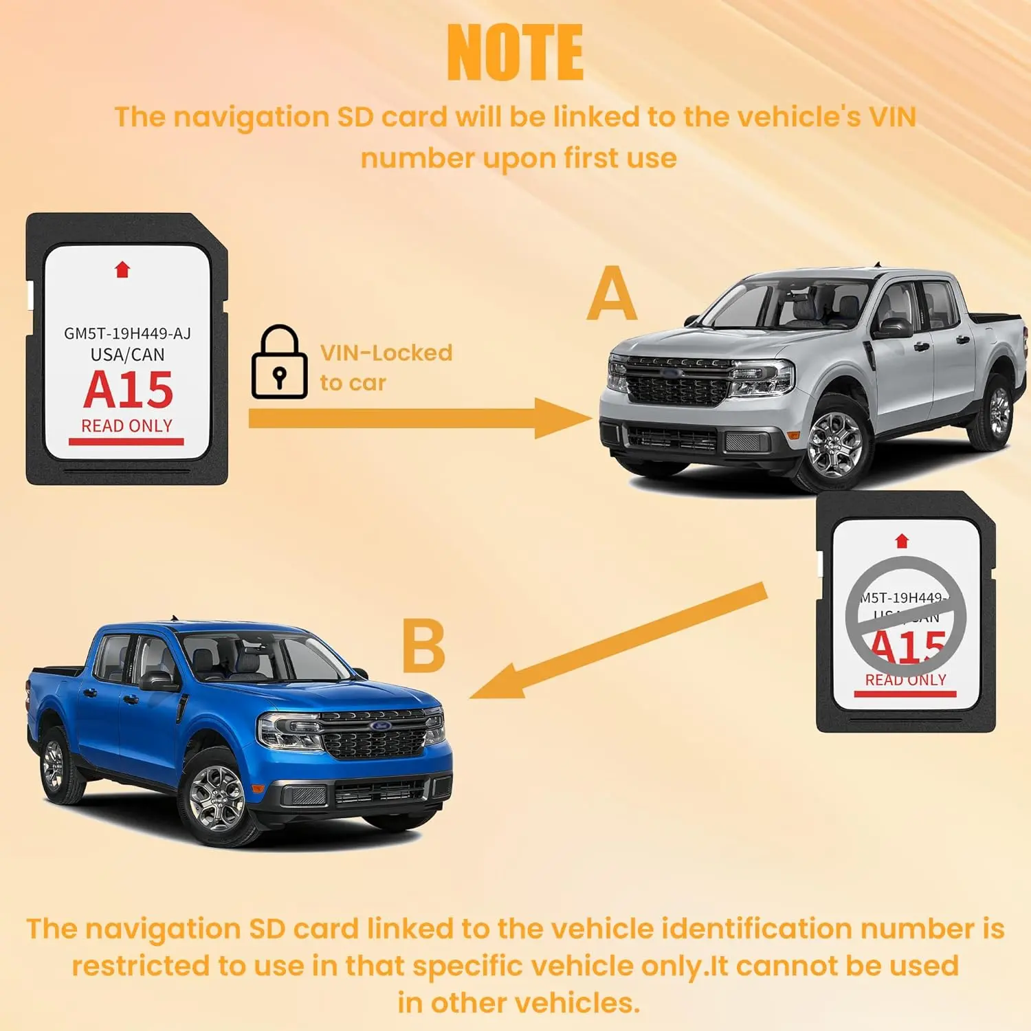 [IMPORTANT NOTES AND SATISFACTION GUARANTEE]Do not insert the A15 navigation SD card into non-vehicle devices, as this may damage the map data. Additionally, A15 Navigation SD cards are locked to the first vehicle once inserted and cannot be switched to another vehicle. If for any reason you are not satisfied with your Ford navigation SD card our customer support team is available 24 hours a day 7 days a week to provide 100 satisfaction service and assistance.