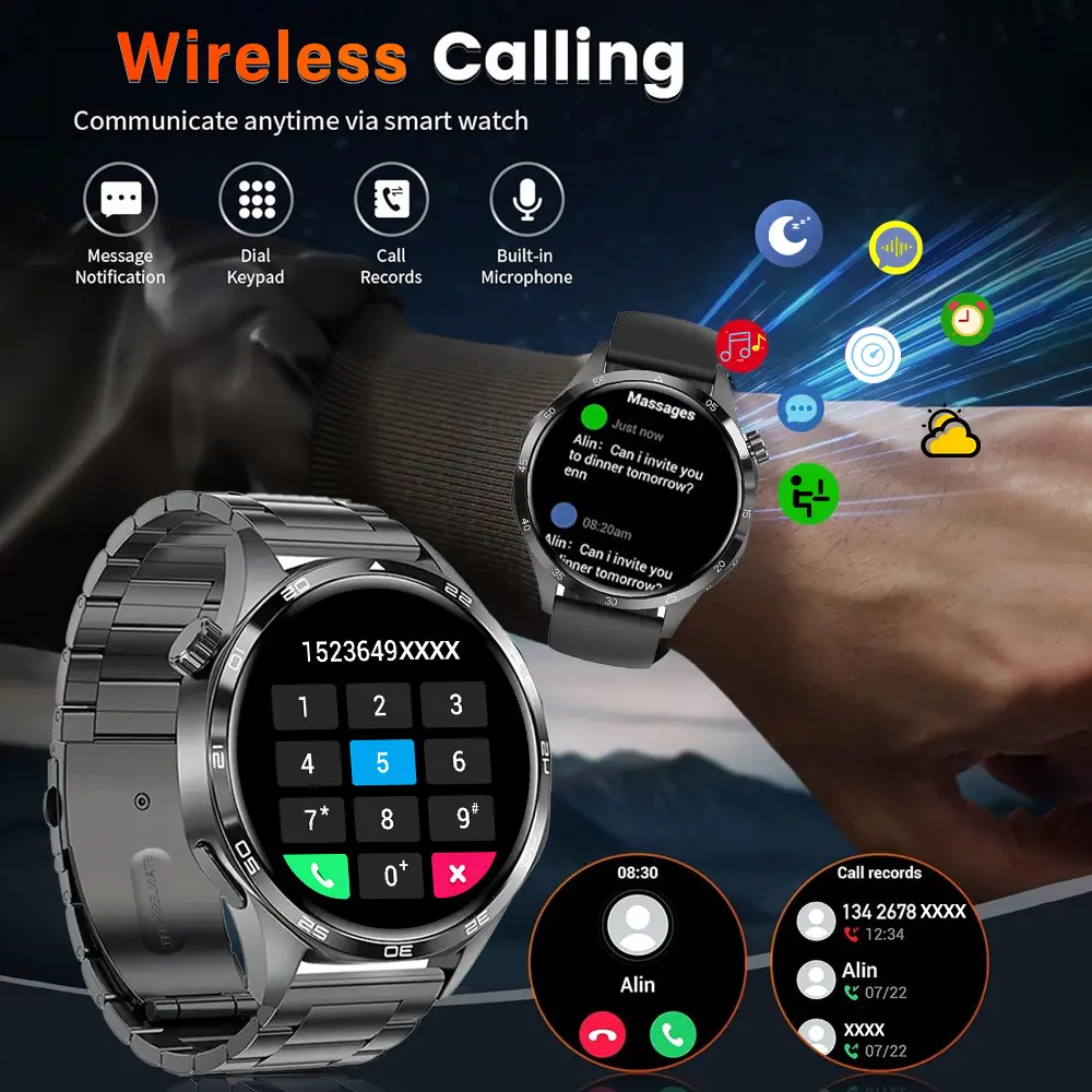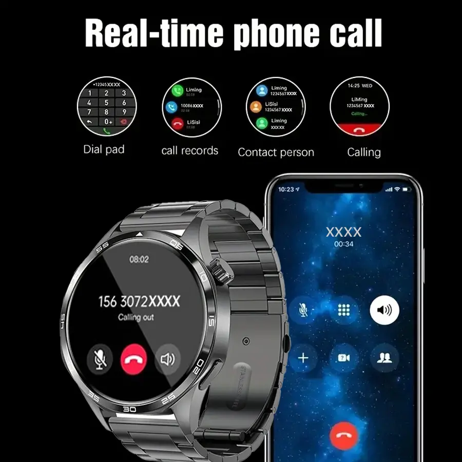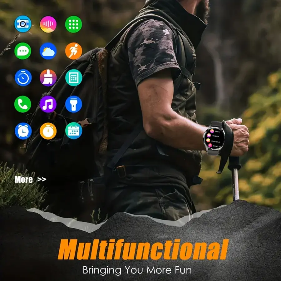 Outdoor smart watch, 1.53-inch touchscreen with wireless calling, over 100 sports modes and watch faces, AI voice assistant, compatible with Android and iPhone, flashlight function, fitness watch wearable device, stainless steel strap waterproof watch.