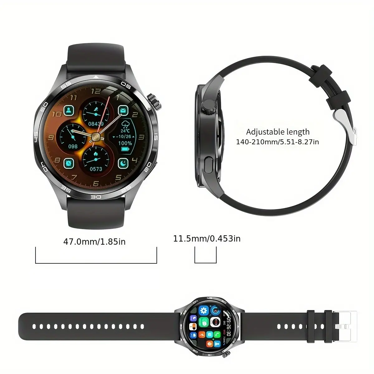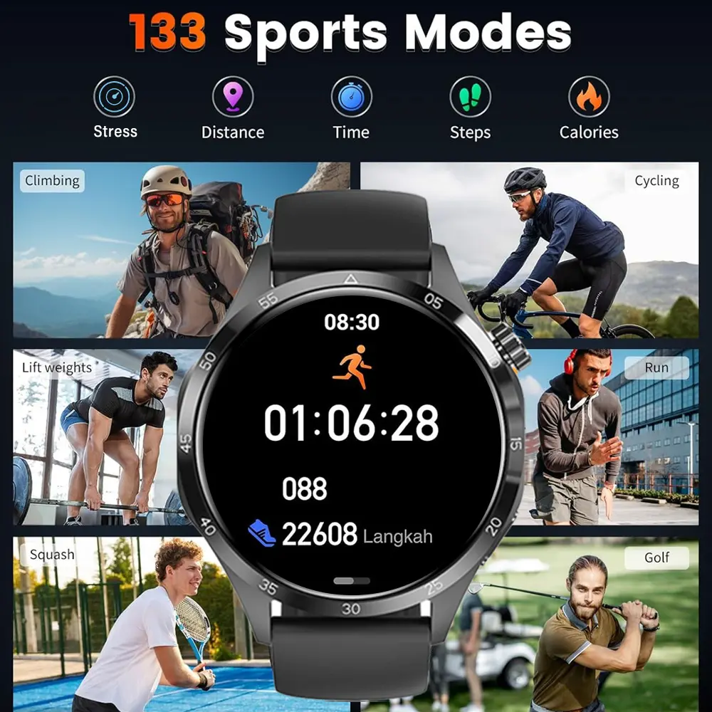 Universal smart sports watch, 1.83 inches HD touch screen, wireless calling, compatible with Android/iPhone, over 100 sports modes, pedometer, blood pressure and heart rate sports tracker, stainless steel and silicone dual strap, waterproof.