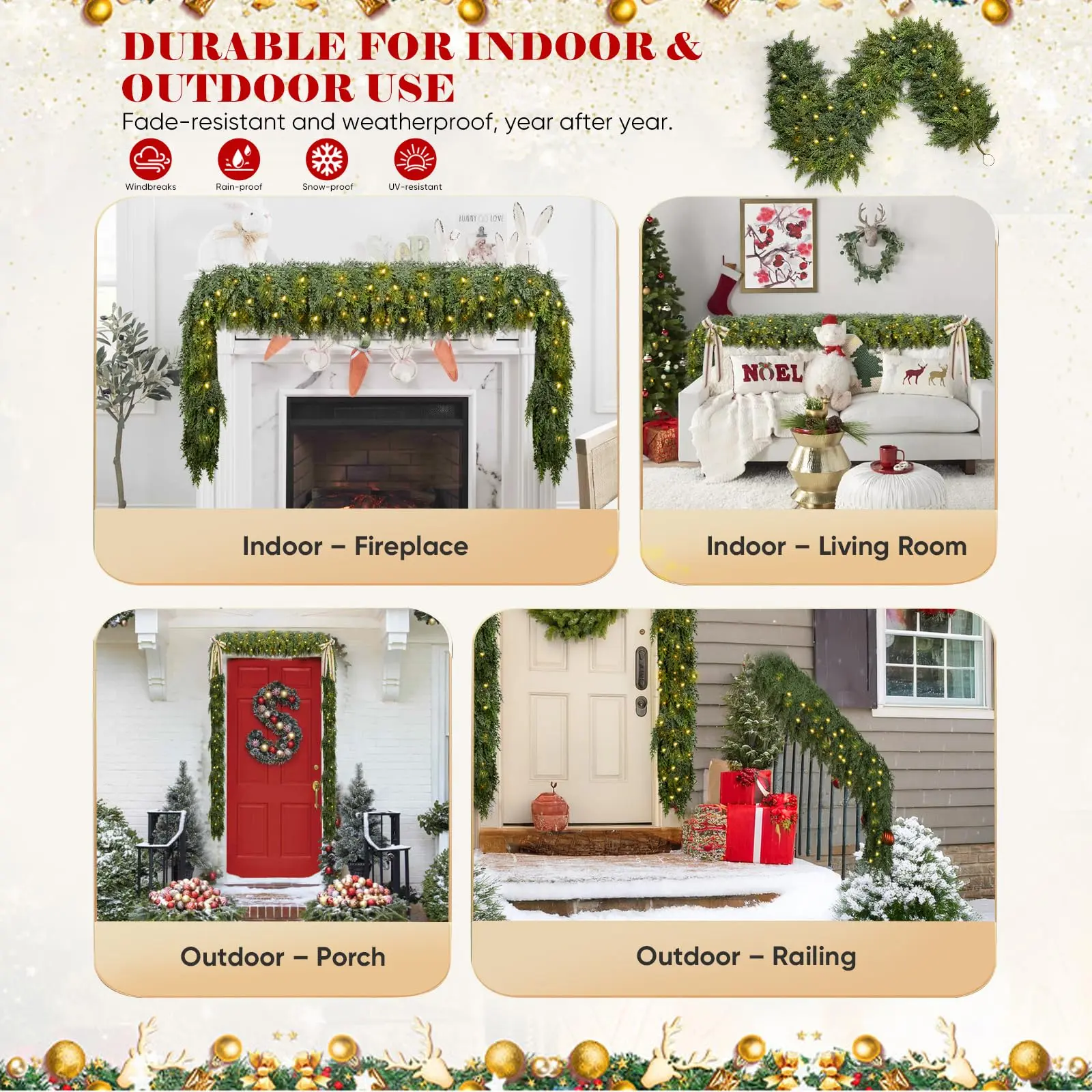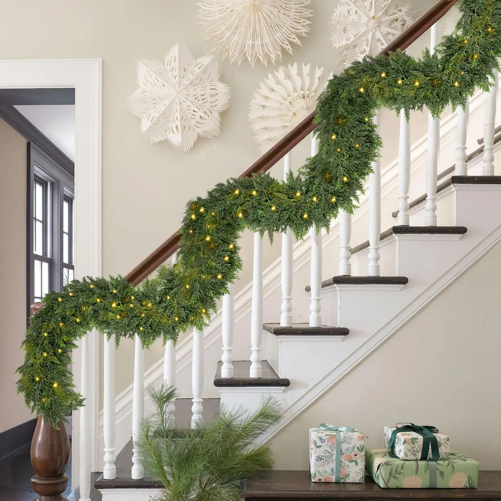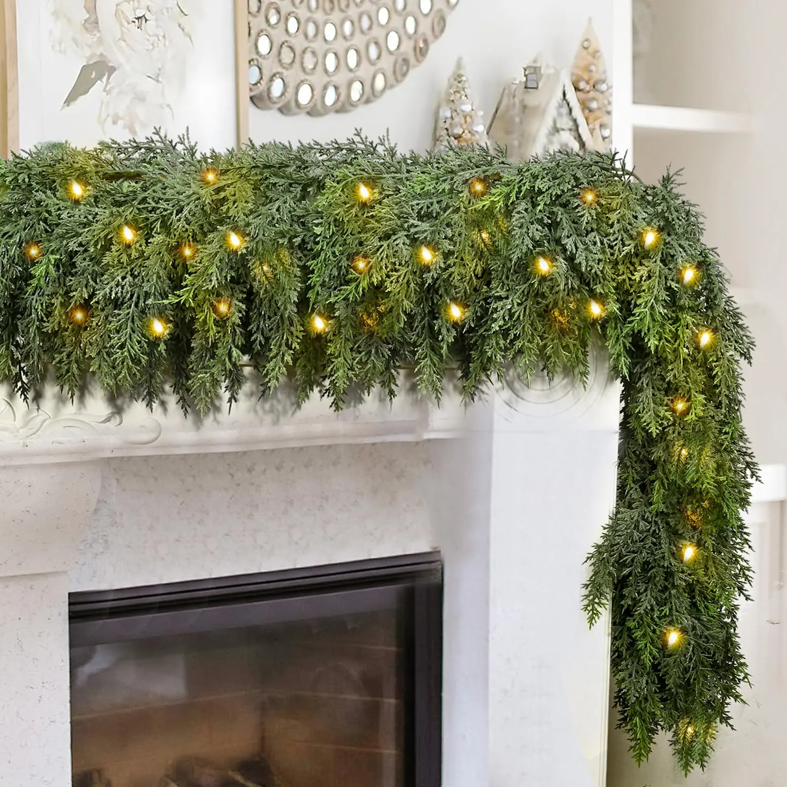 【One Is Enough — 168 Branches & 840 Tips for Ultra-Full Coverage】This upgraded cedar garland that looks real packs 168 branches and 840 needle tips in a single 6FT strand, creating a cushion-soft, thick, full-bodied look without bare gaps. Comes with 30 warm white LED lights (3 m string) offering 8 lighting modes for a cozy holiday glow. Perfect for mantels, stair rails, door frames, and table centerpieces, as well as store displays, shopping malls, office receptions, and daily home décor.
