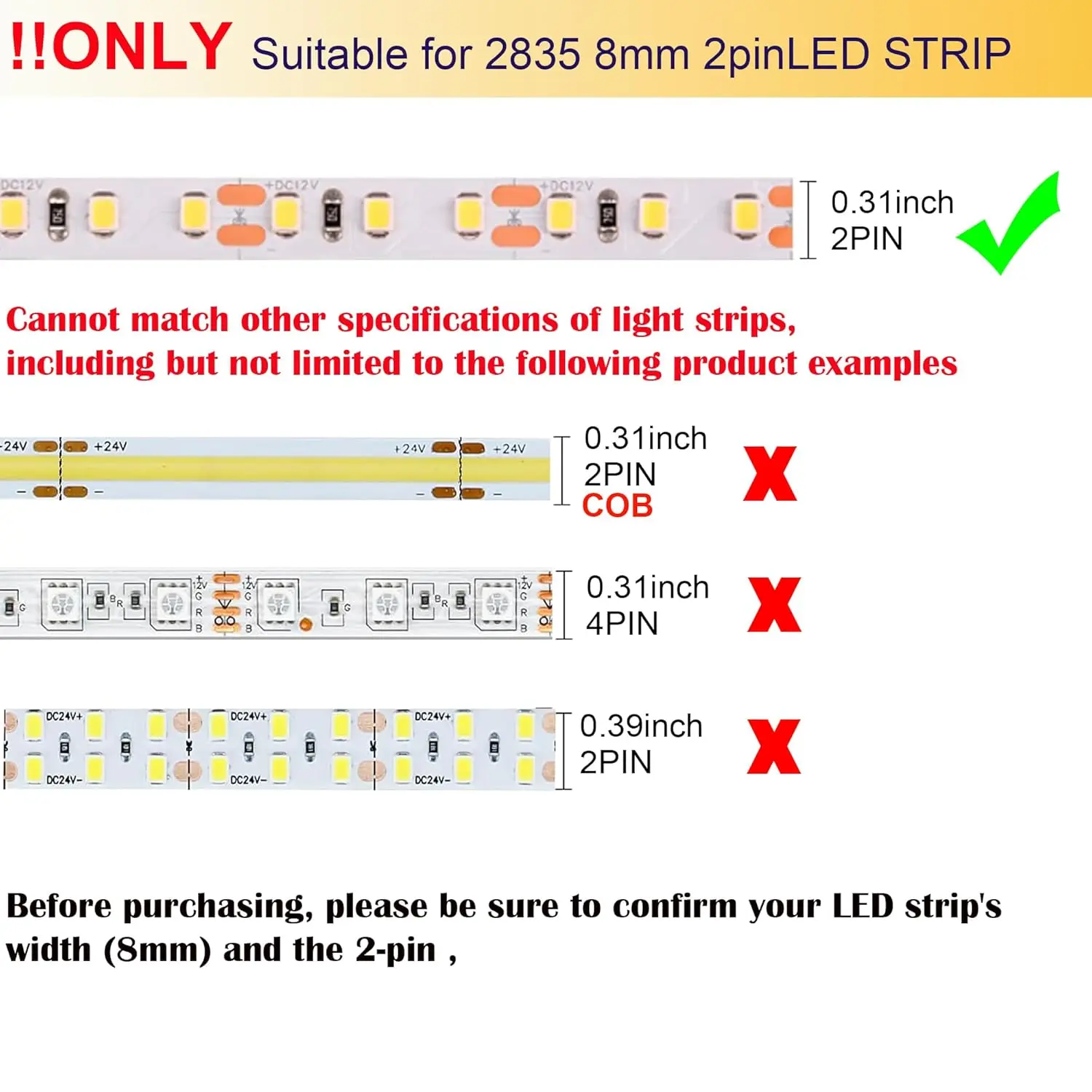 ·Application---Compatible with 2 PIN 8mm Wide SMD 3528/2835 single color Flexible LED Strips, NOT COB or neon lights.